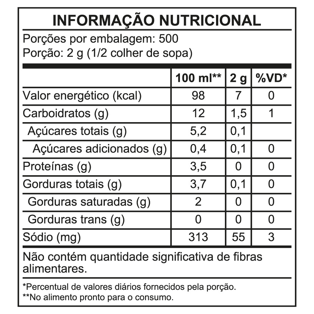 O Molho Branco Bechamel Ajinomoto® é uma mistura em pó para o preparo de molhos com base branca. Possui temperos como noz moscada. Fácil de preparar, necessita apenas de leite. O Molho Branco Bechamel Ajinomoto® deixa os pratos deliciosos, atraentes e mantém o sabor caseiro da receita artesanal. Padroniza a execução da receita, possibilitando ao profissional o mesmo sabor de sempre, sem perder seu toque final. Utilização: Produto versátil e fácil de preparar: Para 1 litro de molho, dissolva 100 g do produto em 1 litro de leite, mexendo até obter a textura ideal. Rendimento: 2 g de produto preparam cerca de 20 ml de molho pronto. Aplicável em massas, lasanhas, carnes brancas, legumes gratinados e receitas que exigem molhos cremosos e estáveis. Condições de armazenamento: Embalagem fechada: armazenar em local seco, fresco e arejado. Após abertura: conservar na própria embalagem bem fechada. Validade: Embalagem fechada: 24 meses.