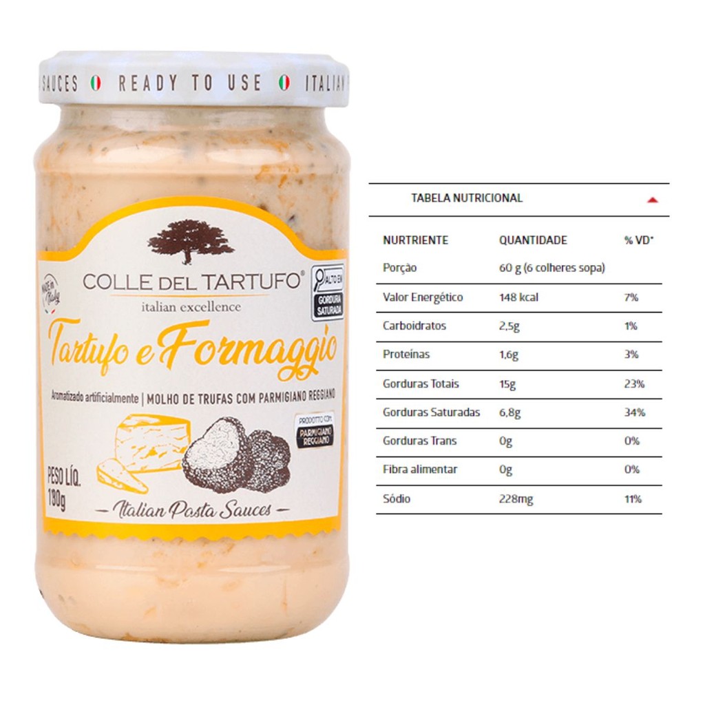 Molho De Trufas com Queijo Formaggio Colle Del Tartufo 180g: A Fusão Perfeita de Sabores Autênticos. O lendário queijo Parmigiano Reggiano combinado com o único gosto da Trufa. Um molho cremoso e de sabor incomparável. Consuma com todos os tipos de massa. Desfrute de uma experiência gastronômica excepcional com o Molho Parmigiano Reggiano Trufado Colle Del Tartufo 180g. Este molho refinado combina a riqueza do Parmigiano Reggiano com a sofisticação das trufas, criando uma mistura irresistível de sabores para elevar suas refeições a um nível gourmet. Características Distintivas: Parmigiano Reggiano Autêntico: Preparado com o lendário queijo Parmigiano Reggiano, este molho apresenta a riqueza e a profundidade de sabor característicos desse queijo italiano de alta qualidade. Trufas Italianas Aromáticas: A adição de trufas italianas confere ao molho uma complexidade aromática única, proporcionando um toque de sofisticação. Textura Cremosa: A textura cremosa do molho torna-o versátil, permitindo ser utilizado em uma variedade de pratos para realçar os sabores. Versatilidade Culinária: Molho para Massas: Sirva sobre massas frescas para uma experiência deliciosa e luxuosa. Finalização de Carnes: Adicione uma colherada generosa como finalização para carnes grelhadas, proporcionando um toque gourmet. Acompanhamento para Petiscos: Use como mergulho para pães, torradas ou vegetais, elevando a simplicidade dos petiscos a uma experiência gourmet. Embalagem Prática: Frascos de 180g: A embalagem prática de 180g mantém o molho fresco e pronto para ser utilizado, oferecendo conveniência e sabor em cada colherada. Experiência Gourmet Inesquecível: Ao escolher o Molho Parmigiano Reggiano Trufado Colle Del Tartufo 180g, você está investindo em uma experiência gastronômica inesquecível. Transforme suas refeições diárias em banquetes gourmet, adicionando este molho sofisticado que combina a tradição do Parmigiano Reggiano com a elegância das trufas italianas. Sinta o sabor da Itália em cada colherada com o Molho Parmigiano Reggiano Trufado Colle Del Tartufo.