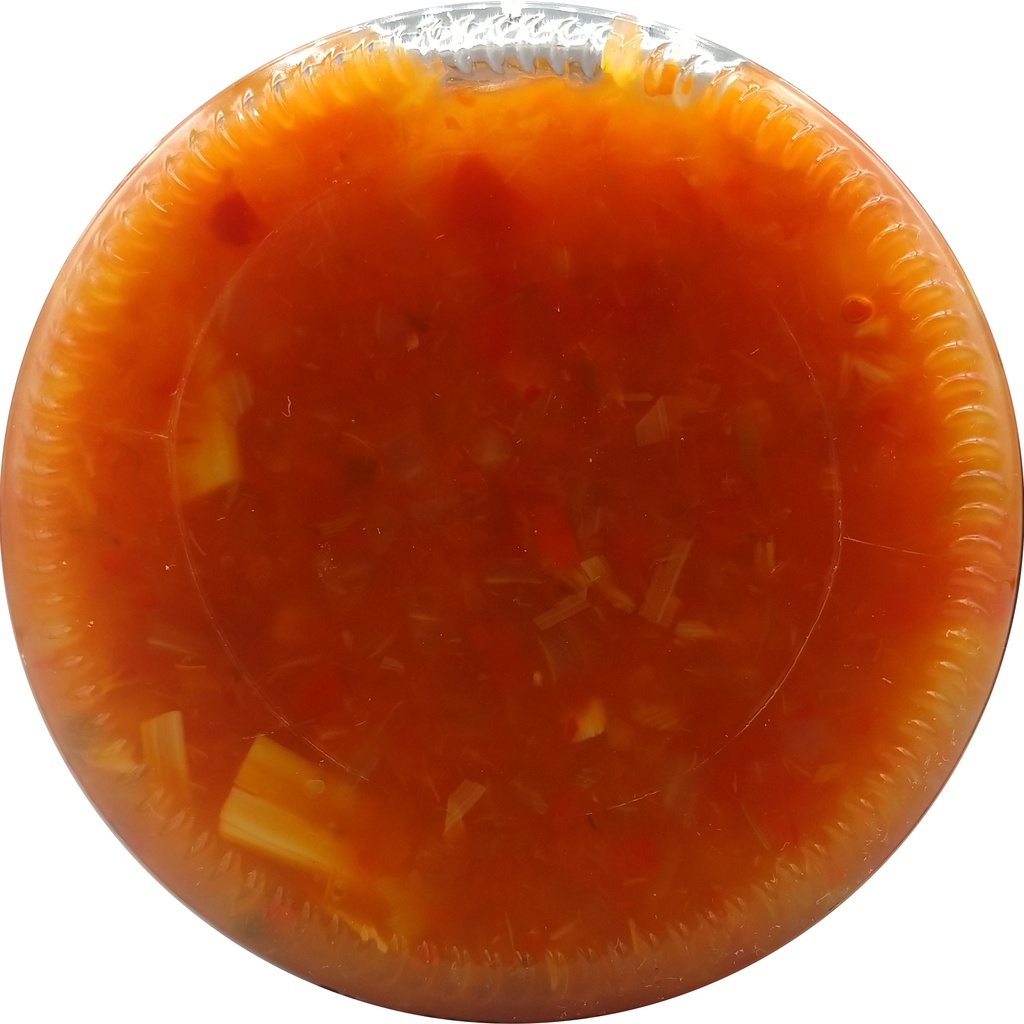 Molho a base de cebola, pimentão e palmito Após aberto, manter o produto refrigerado e consumir em até 7 dias. Peso líquido: 500g INFORMAÇÃO NUTRICIONAL Porção de 15g (1 colher de sopa) Valor energético: 15kcal - valor diário não estabelecido Carboidratos: 0g - 0% Proteínas: 0g - 0% Gorduras totais: 0g - 0% Gorduras saturadas: 0g - 0% Gorduras trans: 0g - 0% Fibra alimentar: 0g - 0% Sódio: 30mg - 1% Cebola, pimentão, palmito, raiz forte de crem, vinagre, sal e condimentos. Não contém glúten. Validade: 1 ano e 6 meses após a data de fabricação.