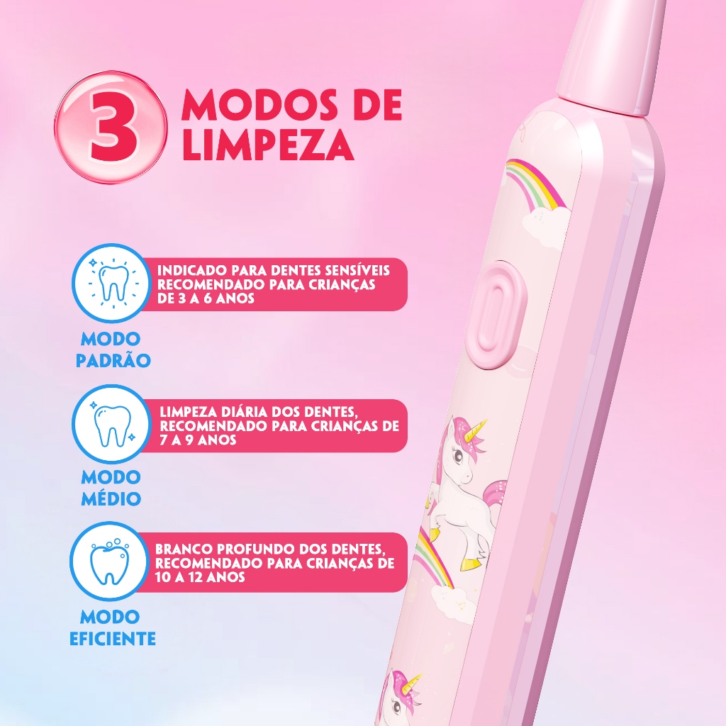 Escova de Dentes Elétrica Infantil Ultrassônica – Divertida e Eficiente para Crianças de 3 a 12 Anos! Transforme a escovação em um momento divertido e supereficaz com a nossa escova de dentes elétrica desenvolvida especialmente para crianças! Com 24.000 vibrações por minuto, ela oferece uma limpeza profunda e gentil, garantindo dentes e gengivas saudáveis desde cedo. 🌟 3 Modos de Limpeza: Modo Suave: Perfeito para dentes sensíveis e recomendado para crianças de 3 a 6 anos. Modo Padrão: Ideal para limpeza diária, indicado para crianças de 7 a 9 anos. Modo Eficiente: Proporciona um branqueamento profundo, recomendado para crianças de 10 a 12 anos. ⚡ Carregamento Rápido e Seguro: Apenas 3 horas de carga garantem até 2 meses de uso!* Prática e perfeita para o dia a dia. 💧 À Prova D’Água IPX7: Pode ser usada com total segurança durante o banho e enxágue! Mas atenção: evite mergulhos prolongados e mantenha a porta de carregamento sempre seca. ✨ Design Infantil Encantador: Cabeco com personagens fofos que tornam a escovação uma experiência alegre e motivadora! As cerdas são extras macias e a cabeça é compacta, ideal para a boquinha das crianças. ✅ Resumo de Benefícios: Tecnologia de vibração ultrassônica 3 modos de escovação conforme a idade Autonomia de longa duração Resistente à água Design lúdico e estimulante Perfeita para presentear e incentivar os pequenos a criarem hábitos de higiene bucal de forma independente e prazerosa! *Tempo de uso pode variar de acordo com a frequência. ✨Parâmetros do produto - Voltagem: 5V - Poténcia: 2.5W - Corrente: 0.5A - Fre quência: 24000Hz/min INMETRO:CE/2024/2707-1 🛒 Compre agora e leve o futuro da higiene oral para o seu banheiro!