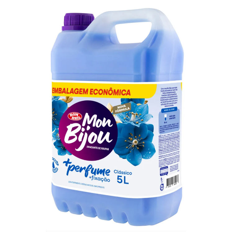Fragrância: Clássico Modo de uso: Após a lavagem completa, adicione 1/2 copo americano (80ml) de Mon Bijou diretamente no reservatório ou diluído em água limpa e enxágue novamente. Conservação: Mantenha o produto em sua embalagem original. Com Mon Bijou +perfume e suas fragrâncias inspiradas na perfumaria fina, suas roupas ficarão perfumadas por muito mais tempo, até depois de secas. Sua fórmula sustentável com base vegetal tem mais cremosidade e fixação, proporcionando uma experiência única de perfumação e cuidado durante o uso, deixando suas roupas mais macias e fáceis de passar. Mon Bijou, Amaciante, Clássico, 5l. Mais perfumação;Mais fixação;Muito mais cremosidade;Fórmula sustentável.