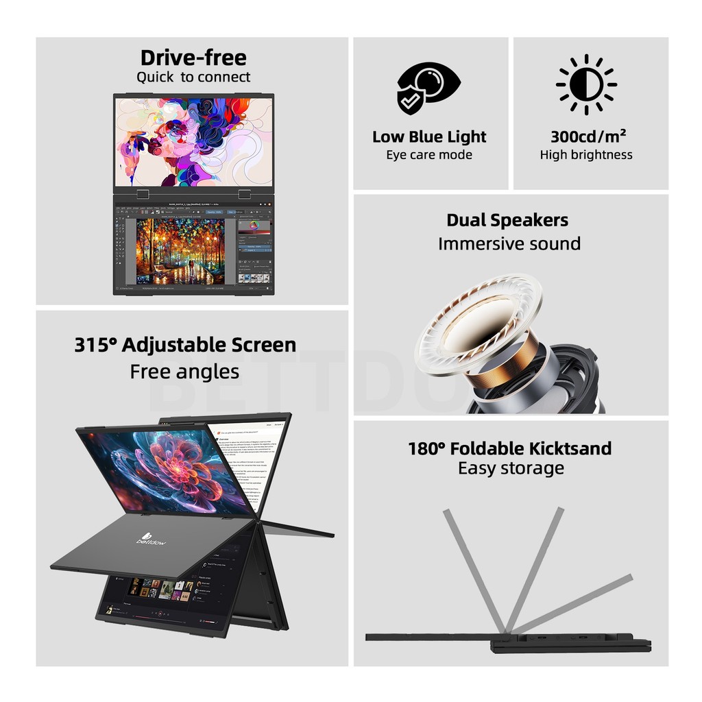 Monitor BETTDOW de 15,6 polegadas com tela dupla, dobrável em 315 graus, portátil, formato 16:9, IPS FHD.