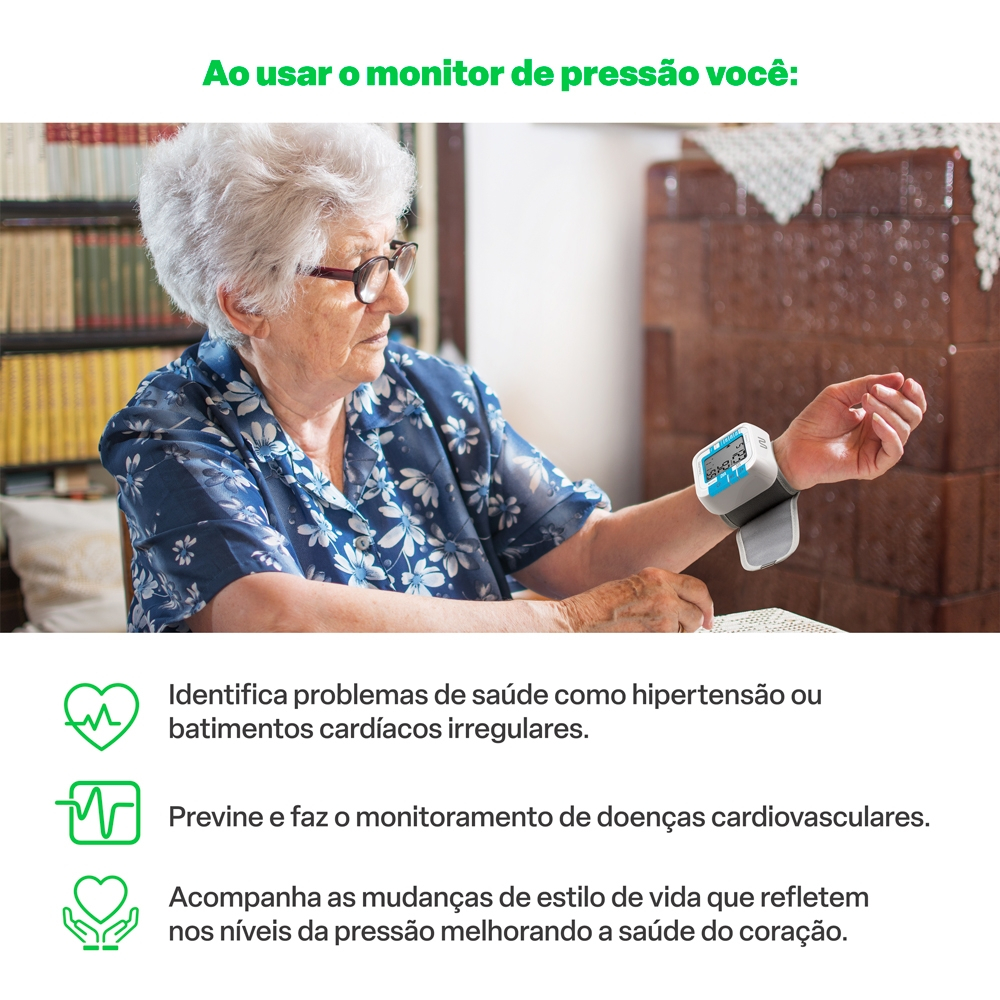 O Monitor de Pressão Arterial de Pulso é a solução definitiva para um acompanhamento preciso e prático da sua pressão arterial. Este dispositivo combina precisão e conforto para oferecer a você um acompanhamento da pressão e ritmo cardíaco de uma maneira prática para o dia a dia. Com o Monitor Arterial de Pulso da linha Multi Saúde, você estará no controle total do seu bem-estar cardiovascular. - Detecção de Batimentos Cardíacos Irregulares: o HC204 possui a capacidade de detectar e sinalizar batimentos cardíacos irregulares. Isso é essencial para identificar possíveis problemas cardíacos precocemente, proporcionando tranquilidade e um cuidado proativo com sua saúde. - Resultados Precisos e Confiáveis: você pode confiar nos resultados deste monitor, pois o produto é submetido à validação e aprovação da ANVISA e INMETRO. - Inflação e desinflação automática da pulseira Dispensa a montagem do monitor deixando a medição mais prática para a rotina. - Realiza a média das 3 últimas leituras Assim você tem uma média de como anda a evolução do ritmo cardíaco. - Para mais de 1 pessoa Possui 2 perfis de usuário e com 99 memórias para cada um, assim, você não precisa apagar os dados armazenados na memória para a outra pessoa medir a pressão. - Fácil de Usar: Este monitor é extremamente fácil de usar, com um design intuitivo que permite medições rápidas e sem complicações. Basta colocar o dispositivo no pulso, pressionar um botão e em poucos segundos, você terá seus resultados. - Alimentação por 2 Pilhas AAA: Para sua conveniência, o Monitor Arterial de Pulso da linha Multi Saúde opera com 2 pilhas AAA. Isso garante uma longa duração da bateria, para que você possa usá-lo sem preocupações por um período prolongado. Oferecemos uma garantia de 6 anos. Ficha Técnica Marca: Multi Saúde Modelo: Monitor de Pressão arterial de Pulso Multi Saúde - HC204 Cor: Branco Pilhas: 2 Pilhas AAA Dimensões do produto (LxAxC): 8 x 8 x 11cm Peso do produto: 0,098Kg Registro Anvisa: 81596329018 Conteúdo da Embalagem: 1 Monitor de pressão de pulso; 2 Pilhas AAA; 1 Manual de instruções *Imagens meramente ilustrativas.