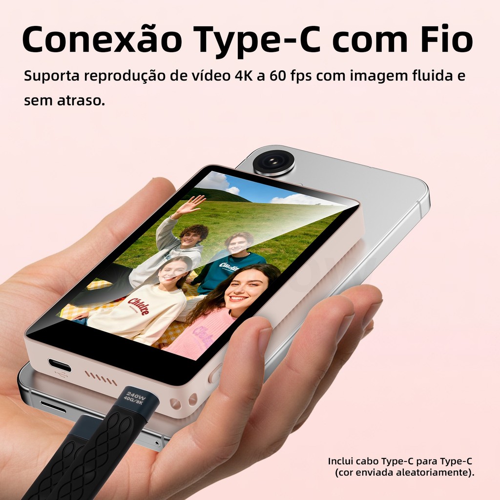 Monitor de selfie magnético: A tela externa para selfies é um display IPS inteligente que se conecta à parte traseira do seu telefone ou pode ser segurado na mão, oferecendo monitoramento em tempo real da tela do telefone e controle remoto para selfies perfeitas, gravação de vídeos, transmissões ao vivo e muito mais, garantindo uma experiência de captura mais fluida e eficiente. Espelhamento de tela sem fio estável: Desfrute de uma conexão sem fio estável de até 20 a 30 metros, sem atrasos. Mova-se livremente durante a gravação, mantendo a tela do seu telefone perfeitamente espelhada. É compatível com a maioria dos iPhones e telefones Android. Saída Ultra HD 4K a 60 fps com fio: Conecte-se via cabo USB-C para obter visuais de nível profissional. O monitor de selfies oferece fotos e vídeos 4K nítidos e com alta taxa de quadros, com detalhes claros e sem travamentos, perfeito para criadores que exigem qualidade de imagem impecável. (Observação: os modelos 1-Phone anteriores ao 1-Phone 15 não são compatíveis com a conexão com fio USB-C.) Controle de obturador Bluetooth integrado: Tire selfies ou fotos em grupo sem precisar pedir ajuda. Com um clique, você pode começar a filmar ou gravar remotamente, facilitando ainda mais a criação de vlogs e transmissões ao vivo. Filme com a câmera traseira: Use a poderosa lente principal do seu celular em vez da câmera frontal desfocada. Tire selfies mais nítidas, obtenha tons de pele melhores e fotos com qualidade profissional que se destacam nas redes sociais. Quando um amigo tirar uma foto sua, você poderá se ver claramente e ajustar instantaneamente. Chega de poses sem visão, tire fotos incríveis sempre. Transmita e economize bateria: O alto-falante integrado permite que você assista a programas e filmes em seus aplicativos de vídeo favoritos usando a função de espelhamento de tela. Mesmo com a tela do celular desligada, a reprodução continua sem interrupções, economizando energia e perfeita para entretenimento em qualquer lugar. Bateria de longa duração e carregamento reverso: Equipado com uma bateria de 1500mAh para uso prolongado em qualquer lugar. Suporta carregamento reverso para manter seu celular ligado durante as filmagens, garantindo que você nunca perca um momento. Modos de inversão e espelhamento: Um toque para inverter ou espelhar garante a orientação correta e uma visão natural. O brilho ajustável facilita a visualização da tela em ambientes externos, enquanto o modo de tela cheia remove as bordas pretas para uma visualização verdadeiramente sem bordas. Compacto e leve: Do tamanho da palma da mão e pesando apenas 1200g, este monitor portátil para selfies cabe facilmente na sua bolsa, pronto para usar a qualquer hora e em qualquer lugar. Especificações: Tamanho da tela: 3,97 polegadas Tipo de painel: IPS Área ativa: 51,84 mm (L) × 86,4 mm (A) Frequência de varredura: 60 Hz Brilho (típico): 300 cd/m² Resolução (H x V): 480 (RGB) × 800 Wi-Fi: Compatível com Wi-Fi 2.4G + 5G Bluetooth: Tecnologia Bluetooth BLE Espelhamento de tela: Compatível com espelhamento de tela com fio via USB-C, AirPlay e espelhamento sem fio Miracast Portas USB-C: 2 MagSafe: Compatível Alto-falantes: Alto-falantes tipo caixa de 6 μm e 1,2 W Bateria: 1500 mAh Autonomia de uso contínuo: 2 horas Validade: 6 meses Compatibilidade com celulares: Compatível com iPhones das séries 15 e 16 e smartphones Android com espelhamento de tela por cabo único Tipo-C. Também suporta o modo de tela dividida para aplicativos de vídeo em celulares Samsung, Huawei, Xiaomi e OPPO