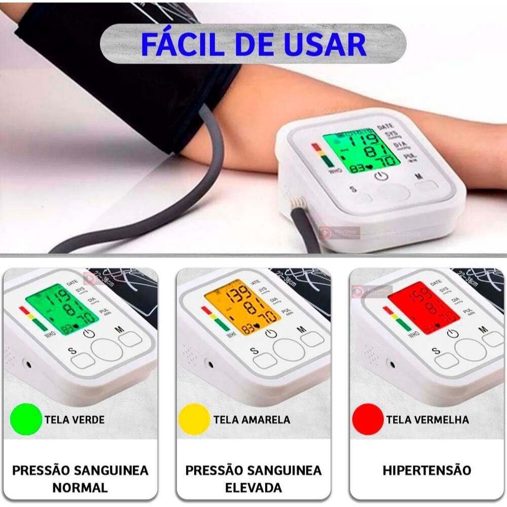 Descrição do produto Prático e Funcional Com este monitor de pressão arterial do braço, você terá a liberdade de assumir sua pressão arterial por conta própria, com autonomia, facilidade e alta precisão clínica. Coloque o punho, ajuste o velcro e comece a medir. Além disso, mede a frequência cardíaca e avisa a presença de batimentos cardíacos potencialmente perigosos irregulares, para evitar possíveis arritmias. Leve e prático Devido ao seu tamanho e baixo peso, você pode usá-lo sem problemas e movê-lo onde quiser. Coloque na carteira ou na bolsa e leve para todos os lugares. Descrição do produto Monitor automático de pressão arterial do braço. Cuide da sua saúde monitorando sua pressão arterial sem sair de casa com este monitor de pressão arterial. Este produto detecta arritmia cardíaca com indicador de hipertensão. Leve alguns cuidados para obter uma leitura confiável. Evite comer evite comer, beber bebidas alcoólicas, fumar, exercitar e tomar 30 minutos antes de tirar a medida. Descanse por pelo menos 15 minutos antes de medir. Sente-se em uma cadeira com os pés no chão. - Sente-se em uma cadeira com os pés planos no chão. Coloque o braço esquerdo em uma mesa para que o punho fique na altura do seu coração - Coloque o braço esquerdo em uma mesa para que o punho fique na altura do seu coração. Descanse e não fale durante a medida. Aguarde de 2 a 3 minutos entre as medidas. O tempo de espera permite que as artes retornem à condição antes da medição da pressão. Pode ser necessário aumentar o tempo de espera de acordo com suas características fisiológicas individuais. Meça sua pressão arterial todos os dias ao mesmo tempo para obter medições consistentes. Características do Características: Detecção de arritmia IHB, classificação de pressão arterial WHO. Inteligência pressurizada ao vivo, voz ao vivo Modo de medição: método oscilométrico Faixa de medição: 20mmHg ~ 280mmHg Faixa de pressão: 0-37,3kpa (0-280mmhg) Taxa de pulso: 40-199 vezes/min Faixa de exibição da faixa de pulso: 0-39,9kpa (0-299mmHg) Pressão estática: 0,4kpa (3mmhg) - Pressão estática: 0,4kpa (3mmhg) Pulso: dentro de 5% Resolução: 0,1kpa Temperatura e umidade de oração: -10 ~ 55 C Umidade: 10% -85% RH Temperatura de uso: 5-40 C Tela LCD de 2,2" Método de escape: Esvaziamento rápido automático Dimensões aproximadas (Metro): Altura: 6 cm; Comprimento: 11,5 cm; Largura: 9,5 cm; Peso: 235 g; Dimensões aproximadas (Cuff): Comprimento: 48 cm; Largura: 14,5 cm; Expansão Normal: 22 - 32 cm; Comprimento do cabo de pressão: 60 cm; Peso: 25 g; Dimensoes aproximadas (Bag): Comprimento: 18 cm; Largura: 16,5 cm; Peso: 25 g; Tensão de tensão: Fonte de alimentação: DC 6V (1,5V quatro pilhas AAA, bateria não incluída); Material da Embalagem: Material: Plástico - Plástico Componentes eletrônicos; Fibra de Nylon; Itens Inclusos: Monitor de pressão arterial (4 x pilhas AAA não inclusas); Manual do usuário (inglês); Manguito de pressão arterial