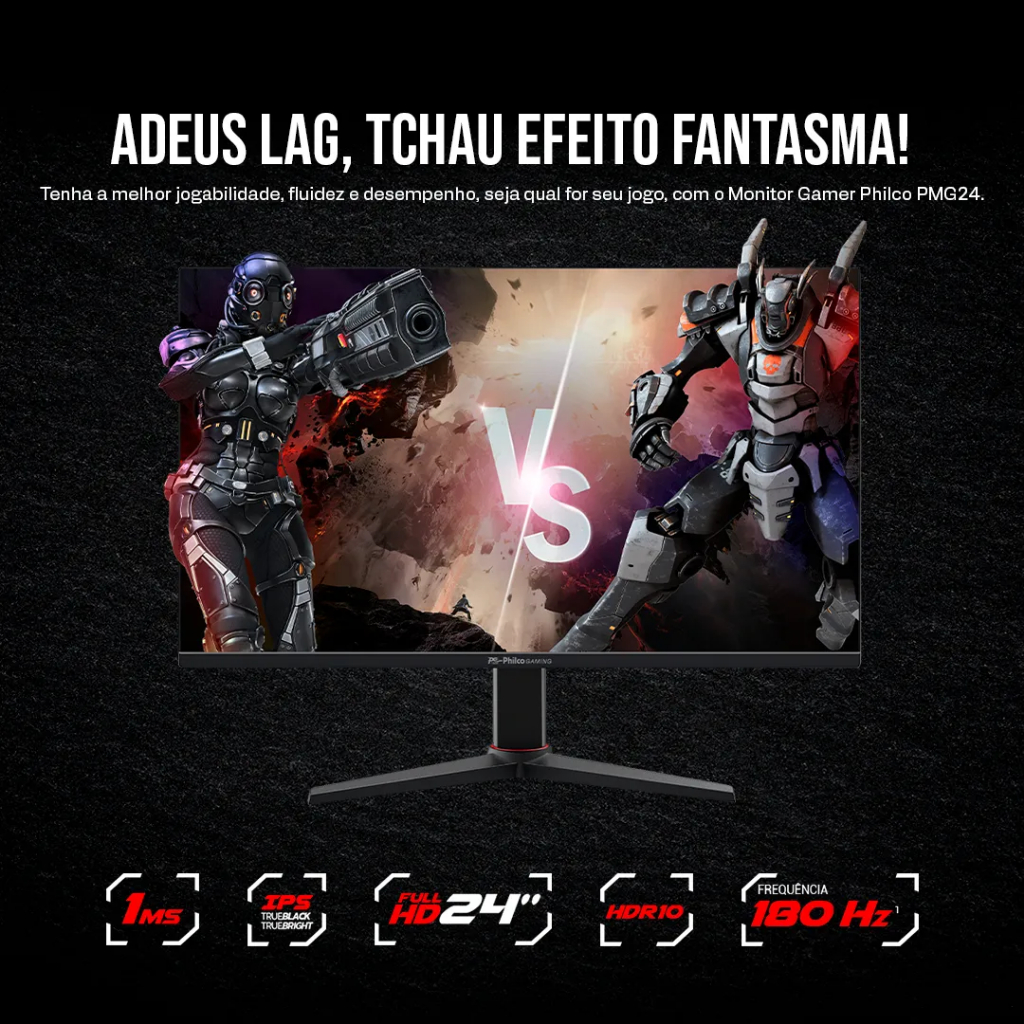 ::: Monitor Gamer ergonômico Philco PMG24M23T ::: O JOGO COMEÇA AGORA! ATENÇÃO - ESTE MONITOR POSSUI AJUSTES DE ERGONOMIA Jogue na sua posição ideal, com imersão total e conforto extremo: - Ajuste de altura da tela - Ajuste de rotação vertical da tela 90º (pivô) - Ajuste de rotação horizontal da base - Ajuste de inclinação da tela, 5º para cima e 15º para baixo Experimente uma nova dimensão em qualidade e desempenho com o Monitor Gamer Philco 24” 180Hz Full HD 1MS PMG24M23T. Domine cada partida com o Monitor Gamer Philco 24" 180Hz Full HD PMG24M23T, feito para quem busca desempenho extremo e imersão total. Sua experiência de jogo ganha outro nível com frequência de 180hz e tempo de resposta de apenas 1 ms (MPRT), garantindo transições rápidas, imagens nítidas e movimentos sem borrões. Perfeitos para jogos competitivos! Com a tecnologia IPS True Black e True Bright, vivencie gráficos incrivelmente realistas, com contraste perfeito, brilho equilibrado e pretos intensos que intensificam a imersão. Sua resolução Full HD 1920x1080 oferece imagens cristalinas, enquanto a Display Port assegura uma experiência visual de alto nível, com atualização otimizada para quadros perfeitos. Adeus lag, tchau efeito fantasma! Tenha a melhor jogabilidade, fluidez e desempenho, seja qual for seu jogo, com o Monitor Gamer Philco PMG24M23T. Principais diferenciais: - Resolução: Full HD com 1920x1080px - Tamanho da tela: 24" LED - Taxa de atualização: 180Hz via HDMI e Display Port - Painel: IPS Trueblack Truebright - Tempo de resposta: 1ms (MPRT) - Tecnologia: HDR10, gráficos realistas, perfeito balanço de contrastes e brilho - Adaptive Sync: Sincronização automática compatível com placas de vídeo AMD Radeon e NVIDIA GeForce Recursos: Tenha a melhor visualização de frames por segundo com o recurso Adaptive Sync: Com a sincronização automática entre a taxa de atualização do monitor e a taxa de quadros das placas de vídeo AMD ou NVIDIA, o PMG24M23T oferece uma experiência de jogo excepcional, eliminando o screen tearing (quebra de quadros) e os atrasos na exibição dos frames. Tempo de resposta 1ms (MPRT): Rapidez no jogo é crucial e o monitor Gamer Philco PMG24M23T tem o tempo real de resposta de apenas 1ms para o Gamer realmente viver toda a emoção sem atrasos. Painel IPS Full HD: O monitor Gamer Philco Gaming PMG24M23T possui a tela IPS, que oferece imagens de alta qualidade e cores precisas, com ângulos de visão de até 170° para destacar a verdadeira emoção do jogo! HDR10: O monitor Gamer Philco Gaming PMG24M23T conta com padrão HDR10 para destacar o conteúdo do game tanto em áreas escuras, como de brilho intenso sendo suportado pela incrível fidelidade de cores. Portas HDMI e Display Port: O monitor Gamer Philco Gaming PMG24M23T possui 2 portas HDMI 2.0 e 1 porta Display Port. Ambas preparadas para trabalhar em 180Hz. Deixe rastros apenas de suas vitórias! Com excelente taxa de atualização de 180Hz, você não terá problema com o indesejado “efeito fantasma”. Modo mira: Selecione entre 3 formatos de mira, para uma melhor precisão durante jogos FPS. Conectividade: - 2 entradas HDMI 2.0: 180Hz - 1 entrada Display Port 1.4: 180Hz - 1 entrada P2 (áudio) Recursos adicionais: - Flicker Free: Conforto visual é essencial para longas partidas. A tecnologia Flicker-free suaviza a cintilação de luz do monitor para você jogar por várias horas, sem perder qualidade de imagem e protegendo a saúde dos seus olhos. - Filter Blue Light: Projeta seus olhos com o filtro de proteção contra luz azul. Especificações completas: - Tamanho da tela: 24" - Design: Gamer, moderno, premium e sem bordas (frameless) - Resolução: Full HD (1920 x 1080) - Tipo de painel: IPS - Tempo de resposta: 1ms (MPRT) - Taxa de atualização: 180Hz - Entrada DisplayPort: Sim, 1x DP1.4 (180Hz) - Entrada HDMI: Sim, 2x HDMI 2.0 (180Hz) - Entrada áudio: Sim, P2 - Ângulo de visão: 170° (Horizontal) x 170° (Vertical) - Brilho: 220cd/m² - Contraste: 1.000.000:1 - Modo mira: Selecione entre 3 formatos de mira, para uma melhor precisão em jogos FPS. - Tecnologia de imagem: HDR10 - Ergonomia: Rotação de 90 graus (pivô), rotação da base e inclinação da tela para cima (5º) e para baixo (15º). O Monitor Gamer Philco PMG24M23T é a escolha ideal para quem busca desempenho profissional, conectando você ao jogo com estilo, qualidade e a emoção de jogar no mais alto nível. Eleve seu setup agora mesmo!