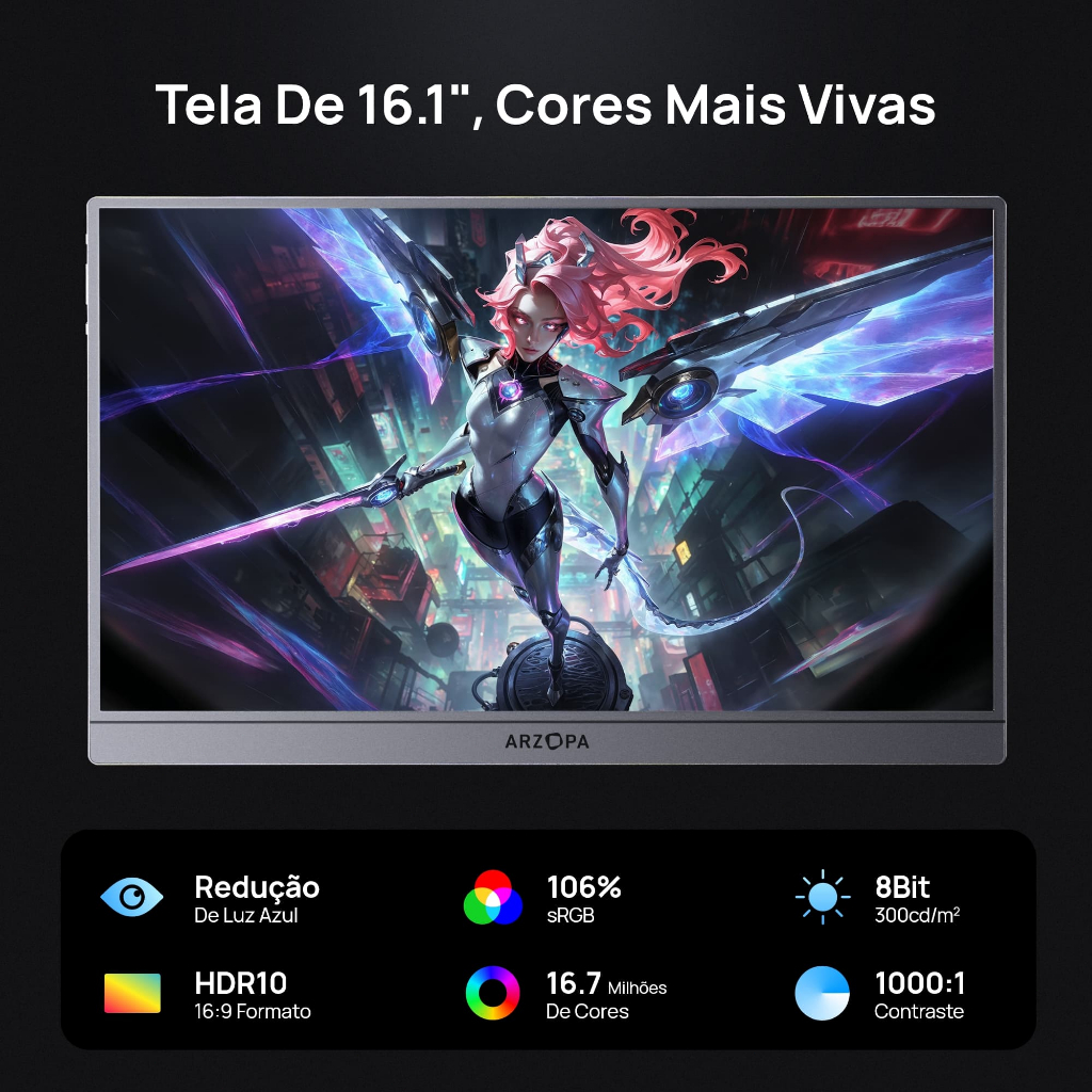 Monitor Gamer Portátil ARZOPA 16.1" 1080P, 144Hz, 106% sRGB, HDR, para Mac, PC, Switch e PlayStation
