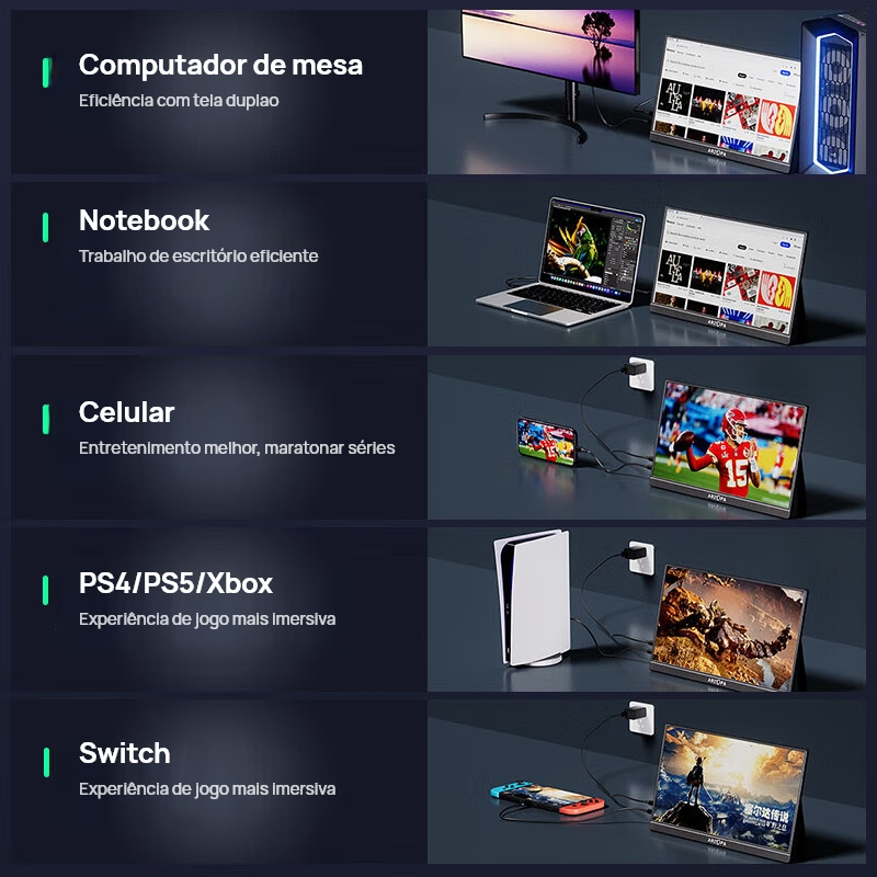 ✨ ARZOPA Loja Oficial ✨ Monitores portáteis e gamers de alta qualidade — perfeitos para trabalho, estudo e jogos. ⚡ Vantagens da Loja: - Produto 100% Original - Garantia Oficial de 2 Anos - Envio rápido em 24–48h - Pronta entrega – estoque em São Paulo - Suporte rápido e atendimento confiável Compre com segurança. ARZOPA, qualidade que você vê! 👉Resumo sobre a especificação: Resumo • Modelo: A1M. • Cor da Caixa: Preto. • Tamanho da tela de 17,3 polegadas. Tamanho da tela: 17,3 polegadas. • Resolução da tela de reposição: 1920 x 1080P (HD completo). • Relação de tela de tela de proteção: 16:9 (tela larga). • Alto-falantes duplos: Sim. • Com HDR: Sim. • Relação de contraste de contraste: 1000:1. • Brilho: 300d/m2 • Tipo de painel: IPS. • Ângulo de visão completa do ângulo de visão total: 178°. • Taxa de atualização: 60Hz. • Tamanho do produto: 394,15 mm * 243,45 mm * 9,7 mm. • Peso líquido do produto: 0,92kg. 👉O pacote do pacote inclui: • Monitor portátil ARZOPA 17,3" • Cabo USB-C para USB-C • Cabo Mini HDMI para HDMI • Guia do usuário ❗️❗️❗️ Dicas quentes: 1. A porta tipo C de cara requer um adaptador para conectar (iPhone precisa de um adaptador tipo C relâmpago que não tenha uma porta tipo C de mesa completa exija um adaptador iPhone precisa de um relâmpago para adaptador HDMI). 2. Porta Tipo C de marcação por favor verifique se a porta Tipo-C do seu aparelho é uma porta Tipo C de toda a face. O monitor portátil Arzopa não será compatível com ele. 3. A porta HDMI HDMI não suporta transmissão de energia. O monitor deve ser conectado a uma fonte de alimentação extra se você usar a porta HDMI/mini DP para conexão. 4.Se o monitor aparecer piscar ou reiniciar ao ajustar o brilho ou outros, verifique se a fonte de alimentação é suficiente para piscar ou reiniciar ao ajustar o brilho ou outros, verifique se a fonte de alimentação é suficiente para o monitor. 5.É necessário que se conecte a um interruptor Nintendo, o monitor com o adaptador original do interruptor Ao se conectar a um Nintendo, é necessário fornecer energia ao monitor com o adaptador original do interruptor.