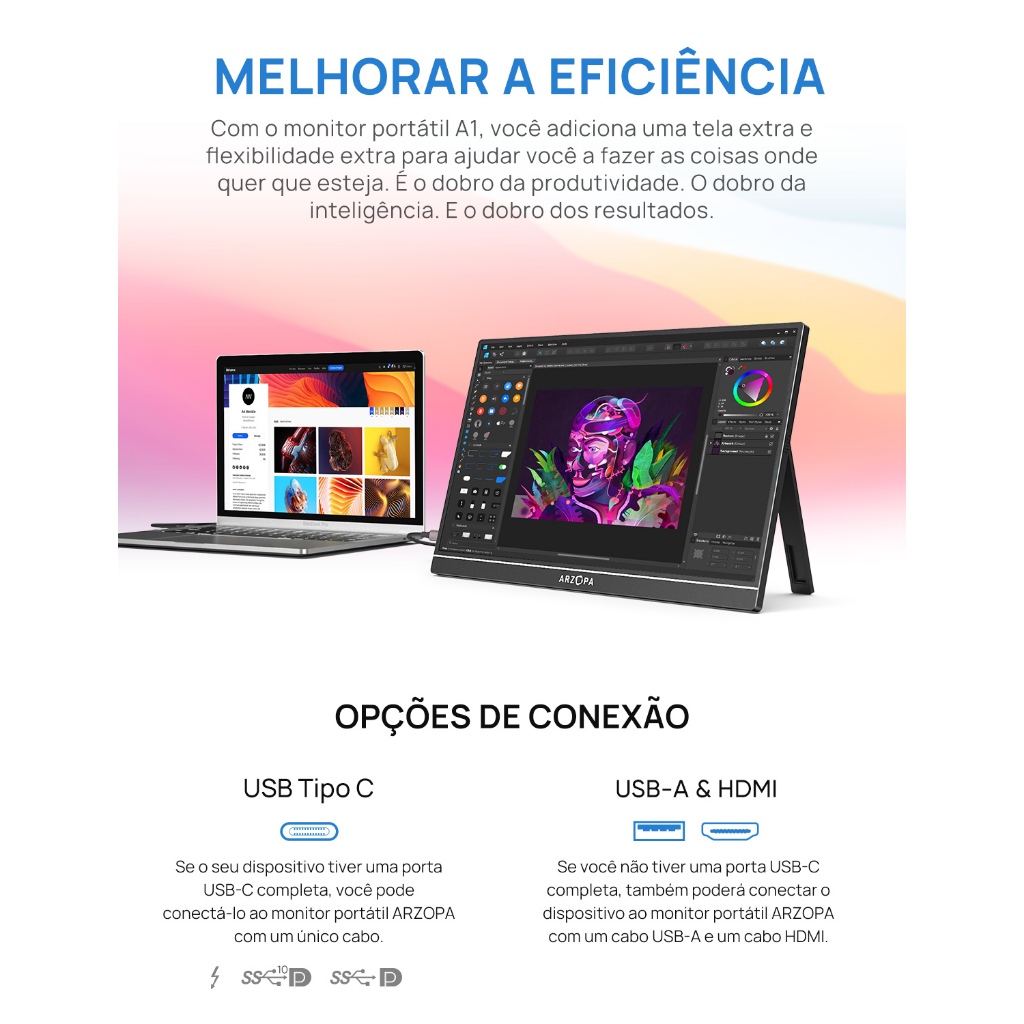✨ ARZOPA Loja Oficial ✨ Monitores portáteis e gamers de alta qualidade — perfeitos para trabalho, estudo e jogos. ⚡ Vantagens da Loja: - Produto 100% Original - Garantia Oficial de 2 Anos - Envio rápido em 24–48h - Pronta entrega – estoque em São Paulo - Suporte rápido e atendimento confiável - Compre com segurança. ARZOPA, qualidade que você vê! 👉Resumo sobre Especificação: • Marca: ARZOPA • Modelo do modelo: A1. • Tamanho da tela: 15,6 polegadas. • Taxa de atualização: 60Hz. • Toque: Não • Bateria interna embutida: Não • Resolução da tela da tela: 1920 x 1080P (HD completo). • Relação de tela de tela: 16:9 (tela larga). • Material da liga do corpo inteiro: Material da liga do corpo inteiro. • Alto-falantes duplos: Sim. • Com HDR+Com HDR: Sim. • Relação de contraste: 800:1. • Gamut de Gamut: 65% sRGB. • Brilho de Brilho: 250 cd/m2 • Tipo de painel do painel: IPS. • Ângulo de visão completa: 178°. • Tamanho do produto: 355mm*220,6mm*9,3mm. • Peso líquido do produto: 740g. 👉O pacote do pacote inclui: Monitor portátil ARZOPA 15.6" Cabo USB-C para USB-C (funcionalizado completo) Cabo Mini HDMI para HDMI (apenas transferência de dados) Cabo USB-C para USB-A (Apenas para fonte de alimentação) • 1 x Guia do Usuário ❗️❗️❗️ Dicas quentes: 1.Porta tipo C de mesa completa, se a porta tipo C do seu computador't é uma porta Tipo C de temperatura total, você pode se conectar com a porta tipo-C ou porta HDMI. Se o seu computador não tiver porta Tipo C de alta temperatura, use HDMI para Mini HDMI para conectar. (iPhone precisa de um relâmpago extra para adaptador HDMI) 2.A porta tipo C do seu telefone se você quiser conectar seu telefone, confirme que a porta tipo C do seu telefone é uma porta tipo C de alta temperatura, mas não apenas para carregamento. Porta USB C de dupla função). 3. A porta HDMI não suporta transmissão de energia. O monitor deve ser conectado a uma fonte de alimentação extra se você usar a porta HDMI/mini DP para conexão. 4.Ao se conectar a um Nintendo switch é necessário fornecer energia ao monitor com adaptador original do interruptor. 5.Este monitor portátil não contém nenhuma bateria. Se o monitor aparecer piscar ou reiniciar ao ajustar o brilho ou outros, verifique se a fonte de alimentação é suficiente para o monitor. Recomenda-se o uso do adaptador de energia que suporta 15W, 5V/3A ou acima para fonte de alimentação.