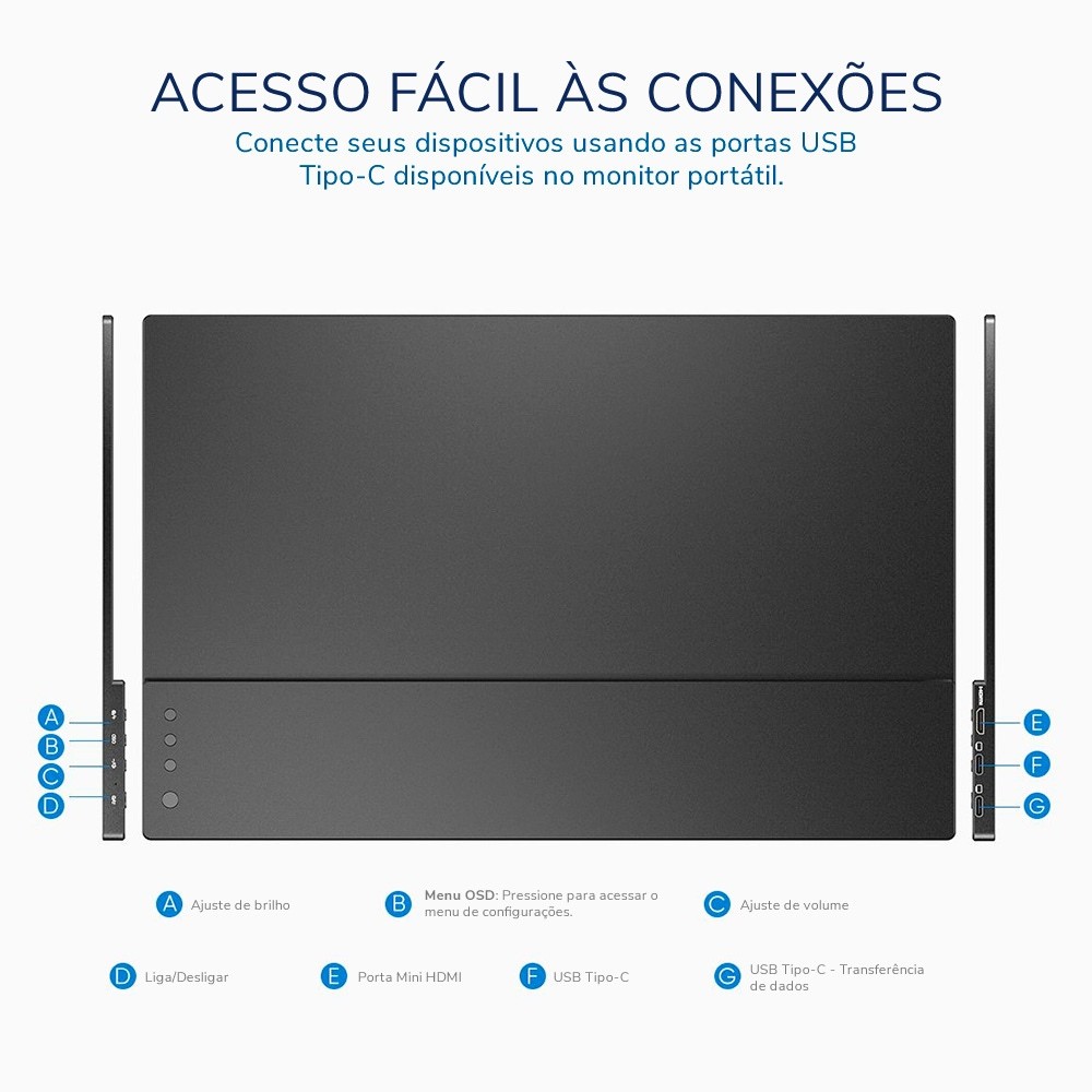 Monitor Portátil Arzopa A1 Gamut 15.6" FHD 1080p 60Hz O Monitor Portátil A1 Gamut 15.6” foi projetado para oferecer flexibilidade e desempenho em qualquer ambiente. Com resolução FHD, tecnologia HDR10, proporciona imagens nítidas, cores vibrantes e um amplo ângulo de visão. Ideal para trabalho, entretenimento e games, é uma solução versátil para expandir sua produtividade e melhorar sua experiência visual. Destaques do Produto: Alta Resolução e Qualidade de Imagem: Tela LCD de 15.6” FHD (1920 x 1080) com contraste dinâmico de até 1100:1, garantindo cores realistas e detalhes nítidos Conectividade Versátil: Possui 1 porta mini HDMI e 2 portas USB-C, permitindo conexão com notebooks, smartphones, consoles e outros dispositivos Modo Dupla Tela: Expanda sua produtividade configurando o monitor à esquerda, direita ou atrás do laptop para maior conveniência Compatibilidade: com USB-C e HDMI – Conecte-se via USB-C (com suporte Thunderbolt 3 ou superior) ou mini HDMI (com necessidade de alimentação adicional) Áudio Integrado: Conta com alto-falantes duplos de 1W, proporcionando um som imersivo sem a necessidade de dispositivos externos Design Inovador: O suporte embutido ajustável permite uso vertical e horizontal, garantindo mais estabilidade e praticidade Especificações Técnicas: Marca: Arzopa Modelo:A1 Gamut Tamanho da Tela: 15.6” LCD Resolução: FHD 1920 x 1080P Proporção: 16:9 Taxa de Atualização: 60Hz Superfície: Fosca (anti-reflexo) Brilho Máximo: 276 cd/m² (padrão 250 cd/m²) Contraste: 1100:1 (medido) | 800:1 (padrão) Ângulo de Visão: 89°/89°/89°/89° (CR 10) HDR: Suporte HDR10 Tempo de Resposta: 25ms (Tr/Td) Alto-falantes Integrados: 2x 1W Conectividade: 1x Mini HDMI, 2x USB-C Entrada de Energia: 5V ~ 20V (suporta entrada PD e PD reverso) Consumo de Energia: 6W (modo de operação) | 1W (modo desligado) Certificações: CCC, FCC, CE, PSE, ROHS, HDMI Garantia: 12 Meses de garantia contra defeitos de fabricação Referência: MOP001 Conteúdo da Embalagem: 1x Monitor Arzopa A1 Gamut 15.6”, 1x Cabo USB-C para USB-C, 1x Cabo Mini HDMI para HDMI, 1x Adaptador de energia, 1x Manual do usuário Indicações de Uso: Trabalho e Produtividade: Expanda sua tela no escritório, em casa ou durante viagens, aumentando sua eficiência em multitarefas Jogos e Entretenimento: Transforme sua experiência com consoles e dispositivos móveis em uma tela maior e de alta qualidade Edição de Conteúdo: Perfeito para designers e criadores de conteúdo que precisam de precisão de cores e amplo espaço de trabalho Uso Versátil: Conecte a notebooks, tablets, smartphones e consoles como PlayStation, Xbox e Switch Aprimore sua experiência visual com o Monitor Portátil A1 Gamut 15,6” FHD 1080P e tenha mobilidade, praticidade e qualidade em um único dispositivo.