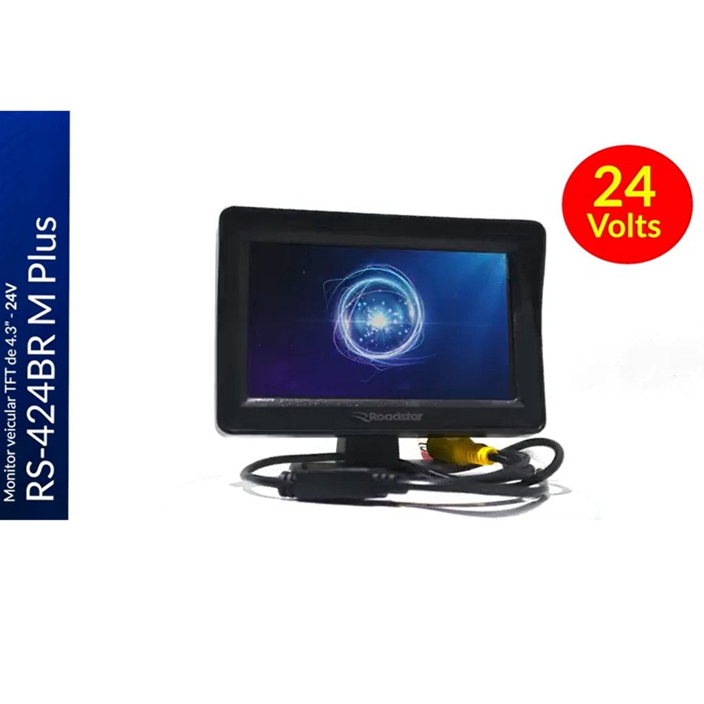 Bem vindo a Loja Oficial Roadstar Shopee - Produtos de qualidade - Preço justo - Despachamos seu aparelho RÁPIDO - Bem Embalado - Testamos seu aparelho antes do ENVIO - Garantia contra defeito de fabricação ### FICHA TÉCNICA DO PRODUTO ### Modelo: Monitor de 4.3" Tela: 4.3" TFT Sistema de Vídeo: NTSC/PAL Resolução: 480x272 Voltagem: 24V Temperatura de trabalho: -10ºC ~ +50ºC Entradas: 2 entradas RCA de vídeo ### Qualidade ### O monitor veicular RS-424BR M Plus é ideal para ser usado em veículos com voltagem de 24V. Manobrar o veículo ficará muito mais fácil e seguro com este monitor, pois o motorista poderá visualizar pontos cegos do veículo, podendo visualizar até 2 câmeras. Este monitor é de fácil instalação.