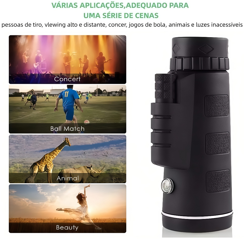 Apresentamos o Monóculo Portátil 40x60 HD, projetado especialmente para ornitorrincos, viajantes, entusiastas de esportes e amantes da natureza. Equipado com zoom poderoso, tripé e suporte para celular, oferece uma experiência visual excepcional. Características do Produto 🔭 Zoom de 10x: Ampliação robusta para observar detalhes incríveis em objetos a longas distâncias. 🌟 Lente Objetiva de 42mm: Proporciona imagens claras e brilhantes, mesmo em ambientes com pouca luz. 📱 Suporte para Celular: Permite acoplar o smartphone para fotografar e gravar vídeos das cenas observadas. 🦾 Tripé Incluído: Oferece estabilidade adicional para visualizações prolongadas sem tremores. 🔒 Design Portátil: Leve e compacto, facilitando o transporte para qualquer local. Especificações Técnicas Ampliação: 10x Diâmetro da Lente Objetiva: 42mm Diâmetro da Lente Ocular: 18mm Material do Prisma: BAK4 Revestimento da Lente Objetiva: FMC Multi-camada Verde (antirreflexo) Revestimento da Lente Ocular: MC Verde Campo de Visão: 200m a 2000m Cor: Preto Peso: Aproximadamente 268g Dimensões: 14,5cm × 5cm × 4,3cm Conteúdo da Embalagem 1 Monóculo Telescópio 1 Pano de Limpeza 1 Bolsa Portátil 1 Corda de Segurança 1 Clip Universal 1 Tripé Telescópico de Alumínio 1 Manual de Instruções Benefícios e Vantagens Visão HD: Lentes de alta resolução deliveriam imagens detalhadas e nitidas. Versatilidade: Ideal para observação de aves, viagens, shows, esportes e outras atividades ao ar livre. Integração com Celular: Captura e compartilha momentos diretamente do smartphone. Facilidade de Transporte: Design compacto e leve, fácil de levar em mochilas ou bolsas. Compre Agora o Monóculo Portátil 40x60 HD! Explore os detalhes incríveis do mundo ao redor e capture momentos inesquecíveis com o Monóculo Portátil 40x60 HD. Faça seu pedido já e eleve sua experiência de observação para o próximo nível!