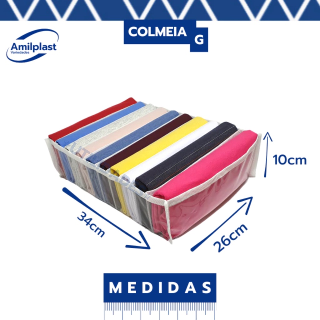 *Colmeias Organizadoras Dobráveis* Diga adeus à desordem e mantenha seu armário arrumado, usando as colmeias organizadoras! Fique despreocupada com pilhas desorganizadas em sua gaveta, dificultando o acesso a peça desejada! Armazene rapidamente e ordenadamente seus peças de roupa, tornando seus itens mais fáceis de encontrar devido à sua transparência. Muito adequado para o armazenamento desde calcinhas, cuecas, meias, camisetas, bermudas, jeans e entre outros itens*. Temos colmeias de 5, 6 e 10 divisórias para classificar e organizar seus pertences e manter seu espaço de vida organizado, melhorando muito a taxa de utilização do espaço do guarda-roupa podendo ser dobrado para economizar espaço quando não estiver em uso mantendo seu guarda-roupa e gavetas limpas e ordenadas. É fabricado em PVC flexível e acabamento em TNT branco. Marca: Amilplast Medidas: Colmeia P 10 Nichos - 34x10x10 Colmeia G 10 Nichos - 34x26x10 Colmeia M 10 Nichos - 34x18x10 Colmeia GG 5 Nichos - 34x26x10 Colmeia Fit 6 Nichos - 35x18x10 Colmeia P Extra 10 Nichos - 40x10x10 Colmeia XG 5 Nichos - 34x26x20 Escolha os modelos para otimizar sua gaveta, cada VARIAÇÃO contém 1 unidade adicione quantos itens desejar! *Vide o tamanho ideal para o que necessita com os nossos atendentes. Produto a pronta entrega em estoque físico, envio imediato no máximo em até 48 horas úteis. ***************************************ATENÇÃO*************************************** -Todos os nossos produtos são CONFERIDOS e TESTADOS antes do envio. -NÃO reutilizamos caixas; os produtos sempre são enviados em caixas novas e resistentes, para que não sejam danificados durante a viagem. -Se ainda assim receber um produto danificado pelo transporte, entre em contato para que não saia prejudicado da compra. PREZAMOS PELA QUALIDADE E PELA SEGURANÇA NA COMPRA!