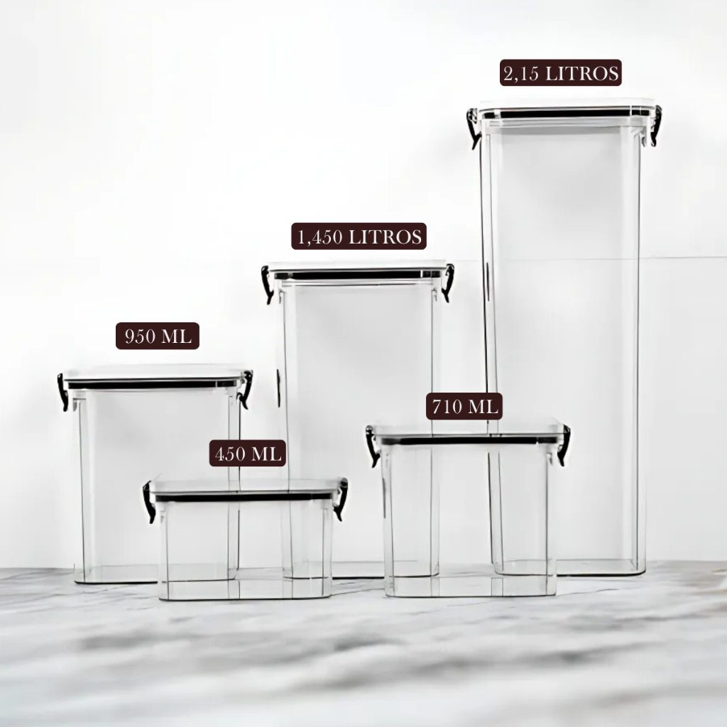 📦 Vantagens de Comprar um Kit de Potes Herméticos Optar por um kit de potes herméticos é uma escolha prática e inteligente para quem busca organização, economia e conservação de alimentos. Confira os benefícios: ✅ Vedação Total: Os potes herméticos possuem tampas com travas e anel de vedação que impedem a entrada de ar, mantendo seus mantimentos frescos por muito mais tempo. ✅ Organização e Visual Clean: Ao padronizar os potes, sua cozinha, armário ou despensa fica visualmente mais bonita e muito mais prática. ✅ Aproveitamento de Espaço: Com formatos empilháveis e tamanhos variados, os kits otimizam o uso do espaço, evitando desperdício de área nos armários. ✅ Versatilidade: Armazene desde grãos, farinhas, massas, até snacks, petiscos ou itens de limpeza — tudo com segurança e praticidade. ✅ Custo-benefício: Comprar em kit costuma sair mais em conta do que adquirir os potes individualmente, além de garantir uniformidade no design. ✅ Durabilidade: Fabricados em plástico resistente e livre de BPA, os potes têm longa vida útil e são seguros para uso alimentar. Se quiser, posso montar também descrições específicas para um e-commerce ou post nas redes sociais. É só me dizer o estilo que você prefere! Kit | Quantidade de Potes | Capacidade (por pote) | Dimensões do Kit (cm) Kit 1 | 4 Potes | 450 ml | 28 x 21 x 17 Kit 2 | 4 Potes | 750 ml | 26 x 16 x 29 Kit 3 | 4 Potes | 1 Litro | 27 x 15 x 32 Kit 4 | 4 Potes | 1,5 Litros | 45 x 15 x 28 Kit 5 | 4 Potes | 2,2 Litros | 26 x 35 x 26 Kit 6 | 5 Potes | — | 29 x 12 x 21 Kit 7 | 6 Potes | — | 44 x 34 x 14 Kit 8 | 6 Potes Grandes | — | 40 x 30 x 17 Kit 9 | 8 Potes | — | 25 x 26 x 24 Kit 10 | 10 Potes | — | 34 x 25 x 40 Kit 11 | 12 Potes | — | 25 x 25 x 40