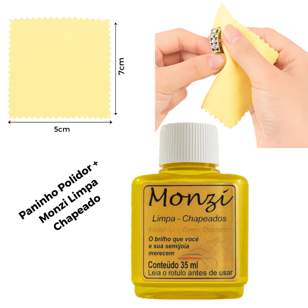 ✨ Kit Monzi Limpador de Joias 35 ml ✨ Solução prática e eficiente para manter suas joias sempre como novas. O Monzi possui versões específicas para cada tipo de material, removendo oxidação, manchas e sujeiras, devolvendo o brilho original em poucos segundos. Tipos de limpadores: 💛 Amarelo: indicado para peças folheadas e banhadas (ouro, prata, ródio e Rommanel). 💙 Azul: exclusivo para prata maciça (925/950). 🤍 Branco: ideal para ouro maciço. Flanela Polidora: Indicada para polimento e manutenção do brilho, removendo marcas leves e ajudando na conservação das joias após a limpeza. ✅ Remove oxidação e manchas ✅ Restaura o brilho das joias ✅ Fácil e rápido de usar ✅ Produto de confiança para conservar suas peças ⚠️ Atenção: siga sempre as instruções de uso de cada cor para garantir a durabilidade das joias.