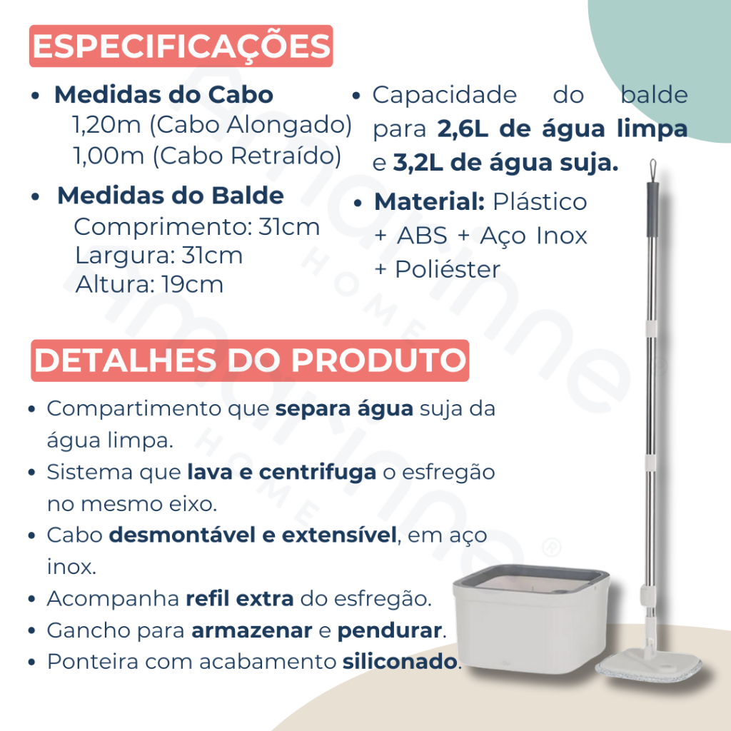 SOBRE O PRODUTO O mop giratório Ou da linha Flow facilita sua rotina de limpeza, tornando o processo mais rápido, higiênico e sem esforço. Seu sistema inteligente permite lavar e centrifugar o esfregão no mesmo eixo, evitando o contato com a sujeira. O visor transparente ajuda a controlar o nível do líquido, enquanto o recipiente interno separa a água suja da limpa, garantindo mais praticidade e uma limpeza eficiente em menos tempo. - Compartimento que separa água suja da água limpa - Sistema que lava e centrifuga o esfregão no mesmo eixo - Cabo desmontável e extensível, em aço inox - Acompanha refil extra do esfregão - Gancho para armazenar e pendurar - Ponteira com acabamento siliconado - Capacidade para 2,6L de água limpa e 3,2L de água suja CUIDADOS Sugere-se higienizar com sabão neutro e esponja macia, evitando produtos abrasivos e não utilizar água quente acima de 40°C durante o processo de limpeza. CONTEÚDO DA EMBALAGEM 1 mop giratório Ou da Linha Flow e um refil extra de microfibra. GARANTIA 90 dias contra defeitos de fabricação.