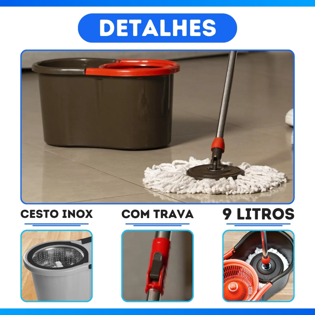 Mop Giratorio Com Balde E Refil Microfibra Centrifuga Inox e Cabo Limpeza Lava e Seca