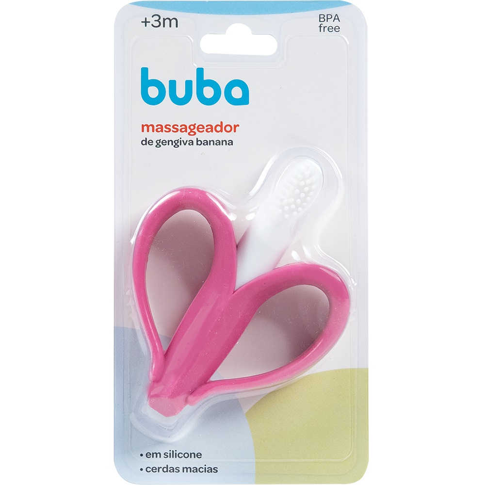 *apenas cerda curtinha modelo de cerdas longas não será mais fabricado pela buba Envio imediato As bananinhas massageadoras mordedoras além de aliviarem as dores também auxiliam no estímulo dos sentidos e a percepção ativa do bebê. O uso das bananinhas é super recomendado para bebês! Além de acalmar as dores na hora de morder e massagear as gengivas, acabam treinando e fortalecendo a musculatura necessária para a mastigação. Assim como todos os produtos direcionados ao bebê, a limpeza dos mordedores deve ser feita com base de água limpa e sabão neutro. Quando maiorzinho, caso deseje, pode lavar as luvinhas na máquina de lavar facilitando a vida da mamãe e do papai! É importante manter o mordedor sempre limpo, garantindo assim a saúde do seu bebê. ----------------- Características do produto: *Material: Silicone *Pacote: 1 unidade *Cor: amarela, rosa, azul *Idade: a partir dos 3 meses *Tamanho: 9x7cm *Lavagem: lavar com água e sabão neutro * Alérgicos: produto não possui contra indicações