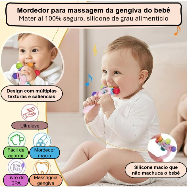 Mordedor e Chocalho para Bebê – Brinquedo de Dentição, Sensorial e Educativo para Coordenação