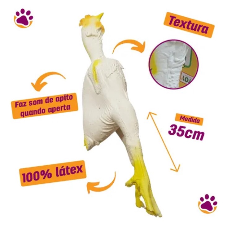 Brinquedo em Látex Frango: - Látex 100% natural; - Pintura não tóxica; - Acabamento bem definido; - Garante diversão e distração para seu pet; - Produto certificado. Marca: - Textoy Dimensões: - Comprimento: 35cm - Largura: 10cm - Altura: 8cm
