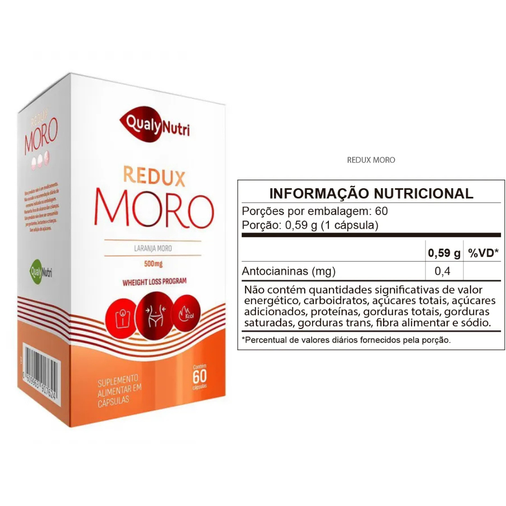 Moro Redux 500mg 60 Cápsulas QualyNutri Descrição do Produto: O Moro Redux 500mg é um suplemento natural elaborado com o extrato seco da Laranja Moro (Citrus sinensis L. Osbeck), reconhecida por suas propriedades antioxidantes e potencial para auxiliar no gerenciamento de peso. Rico em antocianinas, vitamina C e flavonoides, este produto oferece benefícios que vão desde a melhora do metabolismo até a redução de medidas na região abdominal.
