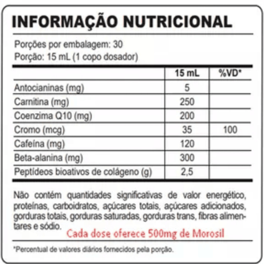Sobre o Produto: Morotim é um suplemento nutricional completo, formulado com 8 ativos cuidadosamente selecionados para promover mais saúde, bem-estar e qualidade de vida. Seu uso regular contribui para o aumento da disposição, melhora do desempenho físico e suporte à saúde geral. Ao ser ingerido, os componentes do Morotim são rapidamente absorvidos pelo organismo e distribuídos pela corrente sanguínea, atuando de forma sistêmica e eficaz. Como Consumir - Ingerir 1 copo medidor (incluso na embalagem) ao dia. - Nos dias com atividade física: consumir 30 minutos antes do exercício. - Nos dias sem atividade física: consumir preferencialmente pela manhã, para aproveitar os efeitos positivos ao longo do dia. - Pode ser ingerido puro ou diluído em água, conforme preferência. Benefícios - Aumento da energia e disposição - Melhora da performance física e mental - Auxílio na recuperação muscular - Fortalecimento do sistema imunológico - Redução da fadiga e do cansaço - Suporte ao metabolismo saudável - Contribuição para o equilíbrio do organismo - Ação antioxidante e anti-inflamatória Alergênicos - Pode conter traços de soja, leite e derivados. - Produto manipulado em ambiente que processa glúten, embora não seja adicionado diretamente à fórmula. Ingredientes - L-Carnitina - Cafeína - Taurina - Coenzima Q10 - Vitaminas do Complexo B - Zinco - Magnésio - Extrato de Guaraná - Aromatizantes e edulcorantes naturais (quando aplicável) Advertências: - Este produto não é um medicamento. - Não exceder a recomendação diária de consumo indicada na embalagem. - Mantenha fora do alcance de crianças. - Gestantes, nutrizes e crianças somente devem consumir este produto sob orientação de nutricionista ou médico. - Conservar em local seco, fresco e ao abrigo da luz. - Consulte um profissional de saúde antes de iniciar qualquer suplementação, especialmente se estiver em tratamento para alguma condição médica. Conclusão: Morotim é a escolha ideal para quem busca um estilo de vida mais ativo e saudável. Com uma fórmula balanceada e de alta absorção, ele oferece suporte nutricional completo para o dia a dia, seja nos treinos ou nas atividades cotidianas. Ao integrar Morotim à sua rotina, você dá um passo importante rumo ao bem-estar e à performance ideal do seu corpo.