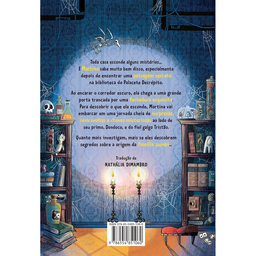 No sexto volume desta série divertida e arrepiante, Mortina descobre uma passagem secreta que finalmente pode revelar as origens da transformação zumbi de sua família. Os pais de Mortina finalmente apareceram, e os preparativos para o jantar de celebração do reencontro estão a todo o vapor! No Palácio Decrépito, a menina busca um acessório especial para a ocasião e, ao vasculhar o guarda-roupa da vovó Nefasta, encontra um bracelete cravejado de pedras coloridas. Logo, Mortina percebe uma coincidência curiosa: o bracelete se encaixa perfeitamente em um entalhe da estante da biblioteca. Com a ajuda de seu primo Dondoco e do galgo Tristão, Mortina descobre que o bracelete é a chave para uma passagem secreta!Mas o que será que há do outro lado? Quanto mais investigam, mais a turma encontra segredos inusitados da família… Será que Mortina vai descobrir por que eles se transformaram em zumbis?Perfeita para leitores que gostam de humor, aventura, suspense e de sentir uma pontinha de medo, a série Mortina une ilustrações e projeto gráfico dinâmicos a um texto leve e divertido, ideal para quem está começando o processo de leitura independente. Indicado para leitores a partir de 6 anos.