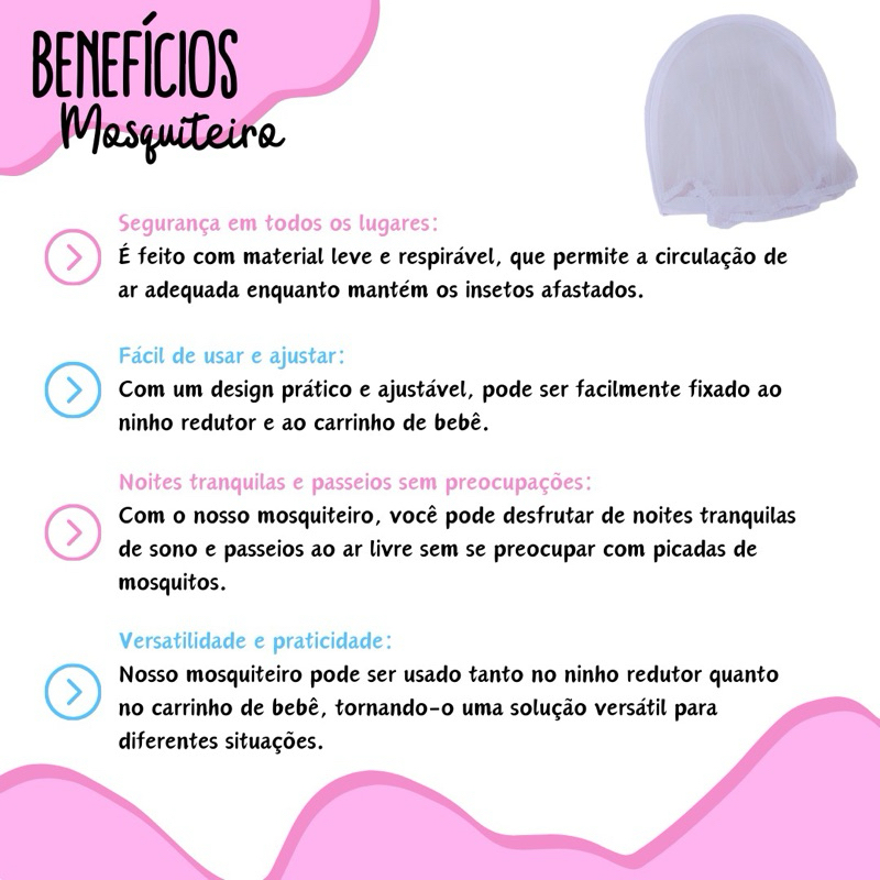 Mantenha Seu Bebê Protegido e Confortável com o Nosso Mosquiteiro! Ideal para carrinhos e ninhos redutores, nosso mosquiteiro é a solução perfeita para garantir que seu bebê tenha noites tranquilas e dias livres de preocupações com insetos. 😴🦟 Características: Proteção Total: 🛡️ Malha fina e resistente que impede a entrada de mosquitos e outros insetos, criando um ambiente seguro e livre de picadas para o seu bebê. Fácil Instalação: 🔧 Com elásticos e bordas ajustáveis, a instalação é simples e rápida, garantindo um encaixe perfeito e seguro em carrinhos e ninhos. Material Respirável: 🌬️ Feito com tecido leve e respirável, permitindo a circulação de ar e mantendo o conforto do seu bebê durante o uso. Portátil e Prático: 🚗 Leve e compacto, ideal para viagens e passeios. Garanta proteção em qualquer lugar com facilidade. Especificações: Dimensões: 📏 Altura: 0,47 cm Largura: 0,40 cm Comprimento: 0,70 cm ⚠️ ATENÇÃO: FOTO DEMONSTRATIVA - O NINHO NÃO ACOMPANHA O MOSQUITEIRO ⚠️ Ideal Para: Pais que desejam proteger seus bebês de mosquitos e outros insetos de forma prática e eficiente. 👶🛡️ Qualquer ambiente onde seja necessário criar uma barreira segura contra insetos, seja em casa ou ao ar livre. 🏡🌳 Garanta noites tranquilas e protegidas para o seu bebê com o nosso Mosquiteiro. 🥰 Adicione ao carrinho e aproveite a proteção que seu bebê merece! 🌙✨