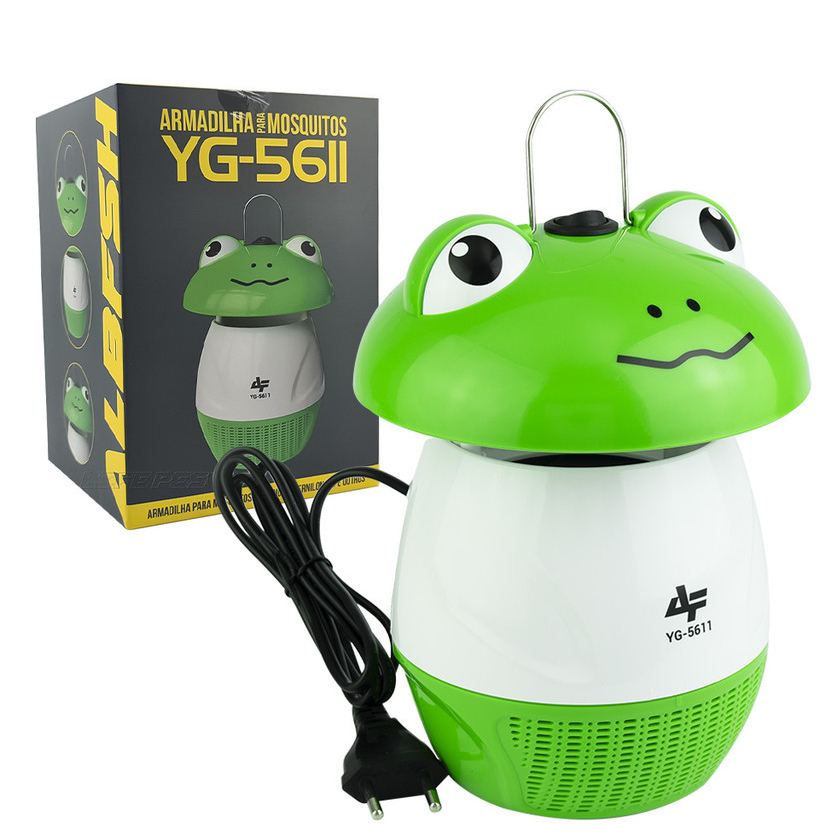 Luminária Led Armadilha Para Mosquitos Albatroz Fishing - YG-5611 Sapinho A Lanterna Armadilha YG-5611 Sapinho é uma solução eficiente e prática para atividades ao ar livre, como pesca e camping. Com design em formato de sapinho, ela oferece iluminação potente com LEDs de alta eficiência e uma autonomia de até 8 horas, além de ter 3 níveis de intensidade de luz. Sua função de armadilha para insetos proporciona maior conforto e segurança, mantendo os mosquitos afastados. Fabricada em plástico ABS resistente, é ideal para uso em condições externas e adversas, e tem alcance de até 35 metros. Sua versatilidade e durabilidade fazem dela uma excelente opção para aventuras noturnas. Fabricada em plástico ABS, a YG-5611 possui uma atrativa e suave luz em Led UV (Ultravioleta) que atrai os mosquitos em um raio de 360º para o interior do aparelho, sugando-os para o compartimento inferior onde são mortos, sem barulho, cheiro ou uso de qualquer tipo de inseticida. Com um design compacto e leve, pesando apenas 374g, é fácil de transportar e pode ser utilizada em diferentes ambientes, como áreas internas e externas, além de ser perfeita para acampamentos, quintais e até mesmo dentro de casa. Com isso você mantém o ar e o ambiente limpo, e sem mosquitos além de ser usado também como uma luminária decorativa e com baixo consumo de energia. Ideal para exterminar moscas e os mosquitos transmissores da Dengue, Zika, Chikungunya entre outros. ••••• Especificações: ••••• • Modelo: YG-5611 Sapinho • Material: Plástico ABS • Leds 360º Ultravioleta • Potência de Sucção: 1,3W • Potência da Luz: 0,3W • Possui botão: Liga/Desliga • Alça Metálica • Alimentação: Cabo AC 90V~270V/50H60Hz • Dimensões (AxLxC): 19x15x15cm • Peso: 374 gramas • Cor: Verde/Branco