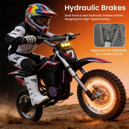 🏍️ Moto Cross Elétrica Infantil: Potência, Segurança e Diversão ao Ar Livre! Seu filho sonha em ser um piloto de motocross? Ou busca um presente que combine aventura, tecnologia e segurança? O nosso Moto Cross Elétrica Infantil de 350W é a escolha perfeita! Com design exclusivo de cross country, freios hidráulicos de alta performance e um sistema de energia seguro, ele proporciona diversão ativa e emocionante — ideal para crianças que amam correr e explorar parques ou estradas de terra. ✨ Principais Vantagens (Por que Este É o Melhor Presente para o Seu Filho?) ✅ Potência Robusta (350W) e Velocidade Controlada: Motor potente de 350W que alcança 20km/h (velocidade máxima), permitindo diversão sem riscos excessivos. Perfeito para crianças que amam velocidade com controle.✅ Segurança em Primeiro Lugar (Freio Hidráulico Duplo): Equipado com Freios Hidráulicos Frontais e Traseiros que proporcionam parada instantânea e segura. Diferente dos freios mecânicos comuns, o hidráulico evita desgaste e garante resposta mais rápida — os pais podem relaxar!✅ 3 Níveis de Velocidade Ajustáveis: Possui 3 modos de velocidade (1/2/3) para se adaptar ao nível da criança. Comece devagar (modo 1) para iniciantes, e aumente gradualmente para crianças mais experientes — segurança e flexibilidade máxima.✅ Bateria de Lítio 36V/4.0Ah de Alta Qualidade: Bateria de longa duração que oferece autonomia de até 12km com uma única carga. Carregamento eficiente e vida útil mais longa da bateria.✅ Design Todo-o-Terreno (Pneu 12"): Pneu inflável de 12 polegadas resistente, permitindo que a criança brinque em diferentes terrenos (estradões, parques, terrenos acidentados) com facilidade e estabilidade.✅ Conforto e Design Moderno: Travesseiro de assento luxuoso e confortável, faróis dianteiros brilhantes (para visibilidade noturna) e uma aparência esportiva moderna que deixa o seu filho o mais "cool" do bairro!✅ Dimensões Adequadas: Tamanho compacto (108cm x 55cm x 70cm) projetado exclusivamente para crianças, garantindo conforto e dirigibilidade. 🧩 Especificações Técnicas (Detalhes Profissionais para Pais Conscientes) ItemDetalhesTipo de VeículoMoto Cross Elétrica InfantilMotor350W (Potente e Eficiente)Bateria36V / 4.0Ah (Bateria de Lítio)Velocidade Máxima20 km/hAutonomiaAté 12 km (Dependendo da Carga e Terreno)FreiosHidráulicos Duplos (Frontal + Traseiro) — Parada InstantâneaNíveis de Velocidade3 níveis ajustáveis (1/2/3)PneusPneus de 12 Polegadas (Infláveis, Resistentes)Dimensões108cm (Comprimento) × 55cm (Largura) × 70cm (Altura)Carga Máxima60 kgDesignCross Country / Todo-o-TerrenoAcessóriosCarregador de Bateria Incluso 🎨 Destaques de Conforto e Segurança 🛡️ Freio Hidráulico de Alto Padrão: Mais seguro e durável do que os freios com cabo comuns. Evita o "escorregamento" do freio e garante uma parada suave e rápida. 💺 Conforto Máximo: Assento ergonômico e travesseiro macio, proporcionando uma pilotagem confortável mesmo em percursos mais acidentados. 💡 Iluminação Incrível: Faróis dianteiros de LED potentes e luzes ambientais nas rodas, tornando o passeio mais seguro e cheio de estilo, especialmente ao entardecer. 🛞 Estabilidade Total: Pneus de 12 polegadas com perfil agressivo oferecem excelente aderência em diferentes tipos de solo, evitando tombamentos. 🎁 O Que Você Recebe? (Pacote Completo!) 1x Moto Cross Elétrica Infantil (Design Esportivo) 1x Carregador de Bateria (Adaptador de Tomada Brasileiro Incluso) 1x Manual de Instruções (Em Português) 🛡️ Dicas de Segurança e Uso (Orientação Essencial para os Pais) Equipamento de Proteção: Recomendamos o uso de capacete, joelheiras e cotoveleiras durante o uso (não inclusos no pacote, mas recomendados). Ambiente de Uso: Dirija apenas em áreas pavimentadas, parques ou estradas privadas — não dirija em ruas movimentadas ou estradas públicas com tráfego intenso. Controle de Velocidade: Inicie com o nível 1 para crianças que estão aprendendo a pilotar. Aumente a velocidade gradualmente conforme a criança ganha confiança e habilidade. Carregamento: Carregue a bateria por 3-5 horas após o primeiro uso e não exceda o tempo de carga para preservar a vida útil da bateria. Supervisão: Crianças menores de 10 anos devem ser supervisionadas por adultos durante o uso para garantir segurança máxima.