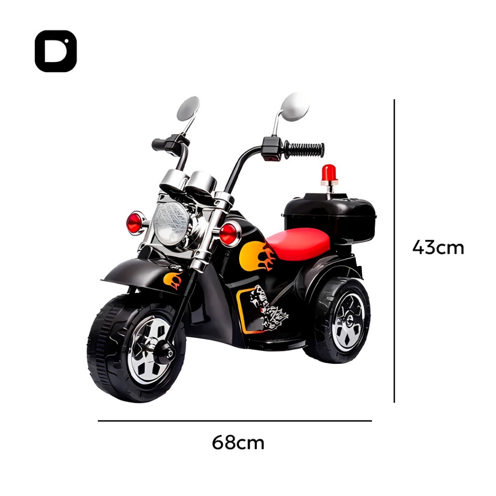Moto Elétrica Infantil Menino Com Som 6v Preta Domni Acelere a diversão com a Moto Elétrica Infantil Domni 6V! Com visual inspirado nas motos clássicas estilo cruiser, essa máquina é perfeita para meninos que adoram aventura, velocidade e estilo. Nossa moto é recomendada para crianças entre 3 a 4 anos e suporta ate 30kg. Principais Características Características: Design Estiloso e Esportivo: Corpo preto com adesivos de chamas em vermelho e amarelo, faróis frontais e retrovisores cromados que imitam uma moto de verdade. Efeitos Sonoros Integrados: Botão de som no guidão para simular o ronco do motor e tornar a brincadeira ainda mais emocionante. Três Rodas para Maior Estabilidade: Ideal para crianças pequenas, com estrutura segura e rodas largas que garantem equilíbrio em qualquer terreno. Compartimento Traseiro com Luz Decorativa: Baú funcional para guardar brinquedos e acessórios, com luz vermelha para dar um toque especial. Especificações Técnicas: Medida aproximadas: 68 x 43 cm (C x L) Cor: Preta Bateria: 6V recarregável (ACOMPANHA CARREGADOR) Idade recomendada: +3 anos Peso recomendado: até 30kg Material: Plástico resistente com acabamento premium Ideal para: Presentes de aniversário, Surpresas de Natal Crianças que amam veículos e aventura Registro Inmetro: 004871/2025