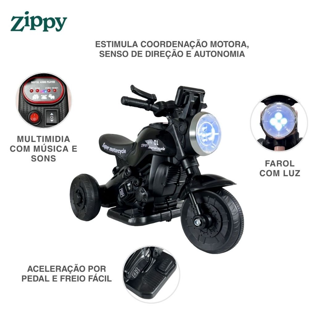 Moto Elétrica Infantil First Custom Frente/Ré 6V - Zippy Toys Transforme o passeio do seu(a) pequeno(a) em uma aventura cheia de estilo e segurança com a Moto Elétrica Infantil First Custom da Zippy Toys, ideal para estimular a coordenação motora, senso de direção e controle físico. Com design esportivo e moderno, esta moto proporciona diversão, conforto e desenvolvimento infantil com tranquilidade. Design, Segurança e Usabilidade: Estrutura resistente de plástico e componentes metálicos, com 3 rodas robustas e estáveis para melhor equilíbrio. Controles intuitivo, aceleração por pedal e frenagem fácil — projetados para uso infantil. Farol com luz de LED funcional e sistema de som integrado que aumentam o engajamento na brincadeira. Botão liga e desliga e botão frente e ré, que garante uma pilotagem mais radical. A Mini Moto First Custom une um visual moderno com funcionalidades que garantem um passeio tranquilo e emocionante para os pequenos. Perfeita para presentear com segurança e diversão garantida, é ideal para promover motricidade, independência e os primeiros aprendizados com relevância e estilo. Benefícios para o desenvolvimento infantil: Ajuda no desenvolvimento da autonomia e confiança, com pilotagem segura e divertida. Design pensado para conforto e equilíbrio, oferecendo estabilidade durante o uso. Principais Características: -ACOMPANHA FONTE/CARREGADOR BIVOLT -DURAÇÃO DA BATERIA DE 1 A 2HORA APROXIMADAMENTE - Idade Recomendada: A Partir de 3 anos até o peso maximos suportado. - Peso Máximo Suportado: 30kgs - Botão Liga/Desliga - Botão Frente/Ré - Farol com Luz de LED - 3 Rodas - Pedal de acelerador - Descanso de pés - Velocidade: 3-5km/h - Bateria Recarregável- tempo de recarga de 3 a 6 horas - Som Embutido - Fácil de pilotar - Rodas estáveis e estrutura resistente para mais segurança - Estimular a independência e a confiança - Design ergonômico que acomoda a criança de forma segura - Ajuda a desenvolver coordenação motora e senso de direção - Estimula a coordenação motora, senso de direção e controle físico - Produto Certificado Pelo INMETRO - Disponível nas cores: Rosa, Preto, Cinza Especificações Técnicas: - Conteúdo da Embalagem: 1 Moto Elétrica Infantil First Custom + Manual - Zippy Toys - Dimensões do Produto (AxLxC): 43,0 x 38,0 x 76,0 cm - Composição/Material: Plástico e Metal - Bateria: 6V/4,5AH - Carregador: 6V500MA - Tempo de Energia: 4-6 horas - Peso máximo: 30kg - Garantia: 90 dias (Contra Defeitos de Fabricação Pelo Fabricante) - Certificação: INMETRO 004498/2025 - Código do Fabricante:11532/ 12535/ 12536 - EAN: 7908216139664/ 7908216140998/ 7908216141001 - Marca: Zippy Toys Imagens Meramente Ilustrativas. As cores e estampas podem variar de acordo com o lote do fabricante.