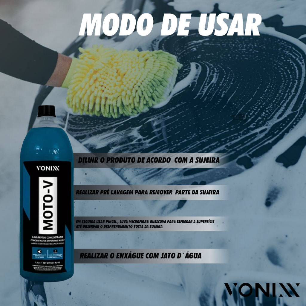 Moto-V é um lava-motos, desenvolvido para limpeza de alta eficiência. Sua formulação equilibrada permite uso, sem agredir, em todas as partes da motocicleta, seja motor, pintura, metais ou plásticos. As possíveis diluições do produto proporcionam ao mesmo a remoção dos mais diversos tipos de sujeira, como barro, lama, graxa e óleo. - Diluição Remoção de graxa e óleo - Até 1:10 - Lavagem diária da pintura - Até 1:20 - Remoção de barro e lama - Até 1:50 Remove barro e lama - Poder desengraxante Modo de usar 1. Diluir o produto de acordo com a sujeira 2. Realizar pré-lavagem a fim de remover parte da sujeira 3. Em seguida, usar pincel, luva de microfibra ou escovas a depender da superfície e esfregar até o total desprendimento da sujeira 4. Por último, realizar o enxágue com um jato d'água - Não nos responsabilizamos pela má instalação ou mau uso do produto, faça a instalação com profissionais especializados. - Atenção: As compras realizadas em nome de Pessoa Jurídica estão sujeitas a cobrança de ICMS, conforme Protocolo ICMS 41, de 4 de Abril de 2008. Caso você tenha dúvidas sobre o percentual a ser aplicado, consulte a Cláusula Segunda, §1° do referido Protocolo. - Em caso de dúvidas use o campo de Perguntas. Fotos meramente Ilustrativas. Caso tenha dúvidas quanto a utilização deste produto, favor consulte-nos pelo campo de perguntas. CÓD. REFERÊNCIA: 015290