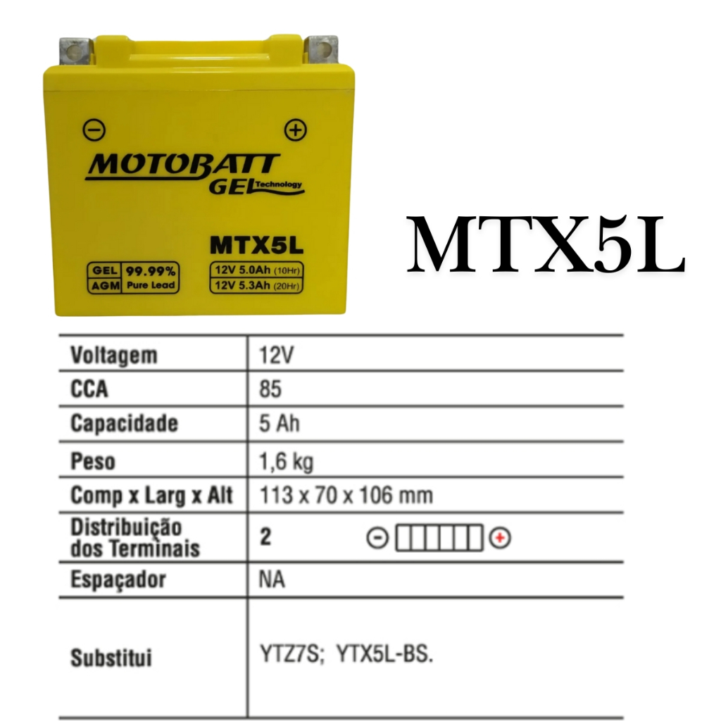Olá, seja muito bem-vindo(a) à LLGBRASIL, a loja mais completa em baterias automotivas e para motocicletas no Mercado Livre. Será um prazer atendê-lo. Antes de efetuar sua compra, fique à vontade para tirar todas as dúvidas pelo campo de perguntas, nossa equipe está à disposição para um atendimento rápido e especializado. Trabalhamos exclusivamente com produtos novos, originais e com nota fiscal. O envio é realizado com embalagem reforçada, garantindo total segurança para que o produto chegue sem avarias. Abaixo seguem as especificações do produto selecionado. Modelo MTX5L, marca Motobatt, capacidade de 5 Ah, CCA de 85 A, peso de 1,6 kg e dimensões de 11,3 cm de comprimento, 7 cm de largura e 10,6 cm de altura. Aplicações Honda: CG 125 KS, ES e ESD, CG 125 Cargo, CG 125 Fan, CG 150 Cargo e Start, CG 150 Fan ESI e ESDI, CG 150 Titan ES, ESD, Mix EX e Mix ESD, CG 160, Biz 125 ES, NXR 125 Bros KS e ES, NXR 150 Bros ES, ESD e Mix, Bros 160, PCX, POP 100, CBR 250R, XR 230, XRE 300 e CRF 450X. Aplicações Suzuki: AH 100 e DR-Z 250. Aplicações Yamaha: YBR 125 Factor K, E e ED, Factor YBR 125 K1, Fazer YS 250 e Blueflex, XTZ 250 Lander, XT 225, XT 250 Z Ténéré e WR 450 F. Produto não indicado para sistemas de ciclo profundo ou uso estacionário, como patinetes elétricos, bicicletas elétricas, cadeiras de rodas, nobreaks, UPS, centrais de alarme, cercas elétricas ou brinquedos. A garantia é de 6 meses a partir da emissão da nota fiscal, válida para defeitos de fabricação, exclusivamente para aplicação em motocicletas. A aplicação incorreta do produto pode influenciar no processo de garantia. Aguardamos a sua compra. Atenciosamente, equipe LLGBRASIL.
