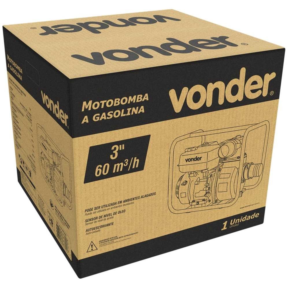Motobomba a gasolina 3", 4 tempos, VONDER. Excelente rendimento (vazão máxima de 60 m³/h) além de possuir sensor do nível de óleo. Bomba autoescorvante, ou seja, ela consegue fazer a sucção da água mesmo contendo ar dentro da tubulação, com isso, pode-se eliminar a válvula de fundo de poço. Indicada para remoção de água limpa de caixas d'água, poços, cisternas, entre outros. Também pode ser utilizada em ambientes alagados, como garagens e porões, com restrição para água com muito barro ou excesso de areia, pedras ou pedriscos. Equipamento sem óleo, necessário abastecer antes do funcionamento. Óleo indicado 10W30. Tipo do motor: Monocilindro - OHV - 4 tempos Potência do motor (cv/hp): 7,0 cv/hp Sistema de partida: Manual retrátil Combustível: Gasolina comum Diâmetro do tubo de entrada da motobomba: 76,2 mm - 3" Diâmetro do tubo de saída da motobomba: 76,2 mm - 3" Sucção máxima da motobomba: 8,0 m Recalque máximo da motobomba: 26,0 m Vazão máxima da motobomba: 60 m³/hora Capacidade do tanque de combustível: 3,6 L Consumo aproximado de combustível (L/h): 2,0 L/h Rotação do eixo do motor: 3.600/min Sistema de ignição: Transistorizado magneto Temperatura do ambiente de trabalho: -15°C a 40°C Capacidade de óleo no cárter: 0,5 litro Tipo do óleo: Óleo indicado 10W30. Dimensões da motobomba (C x L x A): 500,0 mm x 395,0 mm x 446,0 mm Massa aproximada (peso) (kg): 29,0 kg Conteúdo da Embalagem: 1 Motobomba a gasolina. Acompanha: 1 filtro de água.