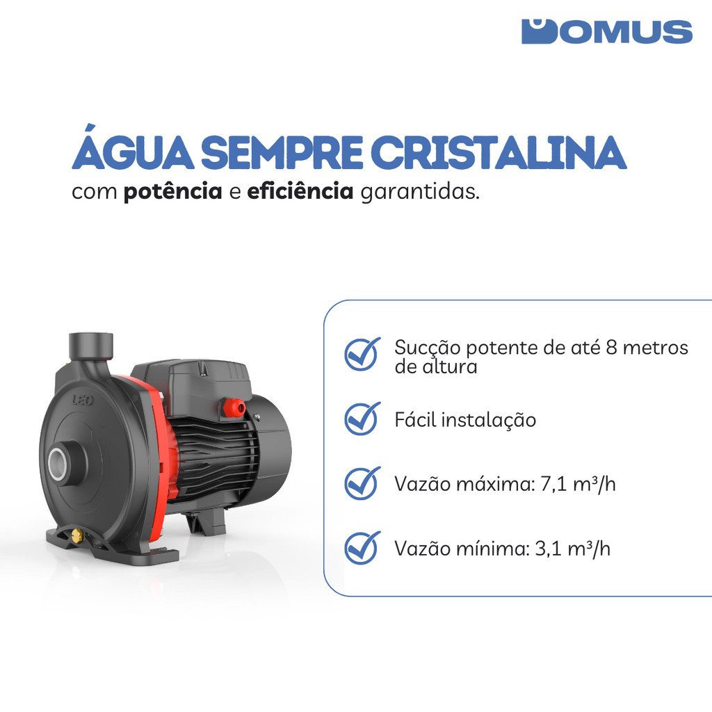 ***PRODUTO A PRONTA ENTREGA COM ENVIO IMEDIATO*** ITEM ORIGINAL COM NOTA FISCAL Somos a Domus, Loja oficial da Shopee. Temos 5 anos de experiência em E-Commerce e nosso maior objetivo é garantir a satisfação dos nossos clientes! Motobomba Centrífuga ACM37 0,5 HP Monofásica 220V Lepono A Motobomba Centrífuga Lepono ACM37 é a escolha certa para aplicações que exigem eficiência e confiabilidade no bombeamento de água limpa. Com motor de 0,5 HP e carcaça leve e resistente, garante excelente desempenho em residências, pequenas irrigações e abastecimentos diversos. Compacta, silenciosa e com baixo consumo energético, oferece grande vazão e alta durabilidade. Diferenciais do produto: Motor de alto rendimento com baixa corrente nominal Design compacto e estrutura resistente Rotor em Noryl para maior durabilidade Sistema de selo mecânico de alta vedação Funcionamento contínuo para maior praticidade Informações técnicas: Modelo: ACM37 Potência: 0,5 HP (0,37 kW) Tensão: 220V monofásico Corrente nominal: 3A Frequência: 60 Hz Rotação: 3450 rpm Vazão: 30 a 100 litros/min Altura manométrica: 10 a 23 mca Tipo de trabalho: contínuo Diâmetro selo mecânico: 12 mm Rolamentos: 6201-2Z duplo Classe do motor: F Grau de proteção: IPX4 Temperatura máxima do líquido: 60°C Temperatura máxima ambiente: 40°C Capacitor: 10 µF / 450 VAC Conteúdo da embalagem: 1 motobomba Lepono ACM37 e Manual do usuário. Produto original com garantia contra defeitos de fabricação. Escolha eficiência e desempenho para seu sistema de bombeamento com a qualidade Lepono!