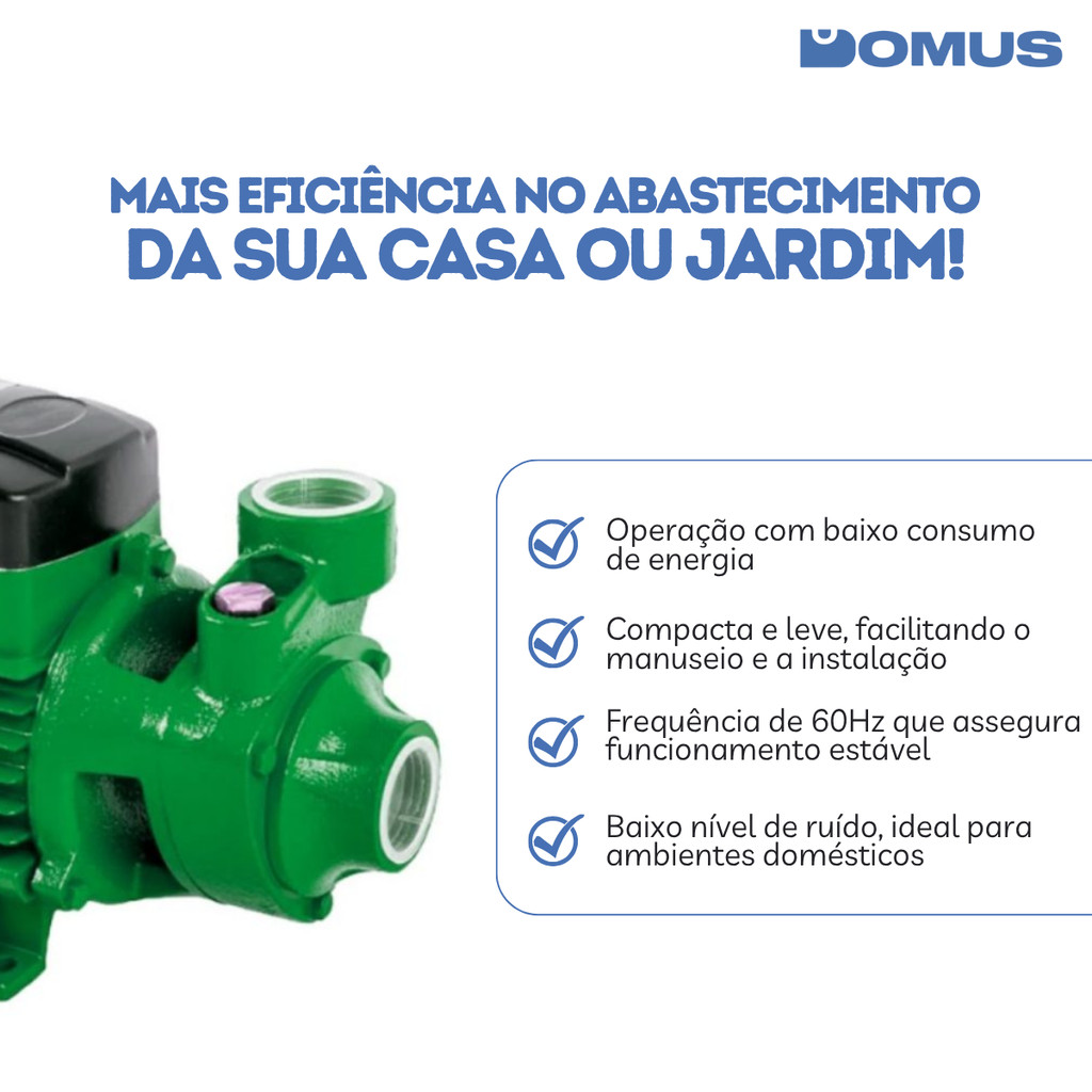 ***PRODUTO A PRONTO ENTREGA COM ENVIO IMEDIATO*** ITEM ORIGINAL COM NOTA FISCAL Somos a Domus, Loja oficial da Shopee. Temos 5 anos de experiência em E-Commerce e nosso maior objetivo é garantir a satisfação dos nossos clientes! A Motobomba Periférica Menegotti MQB60 foi projetada para aplicações que exigem pressão constante e confiável. Com motor de 1/2 cv e funcionamento bivolt (127/220V), é ideal para residências, pequenas irrigações, abastecimento de reservatórios e pressurização de redes hidráulicas. Compacta, econômica e resistente, proporciona desempenho superior com baixo consumo de energia. Destaques do produto: Motor de 1/2 cv ideal para pressurização leve e constante Sistema bivolt (127/220V) com frequência de 60Hz para maior versatilidade Alta eficiência energética com baixo nível de ruído Carcaça robusta que garante longa vida útil Informações técnicas: Marca: Menegotti Modelo: MQB60 Tipo: Motobomba periférica Potência: 1/2 cv Voltagem: Bivolt 127/220V Frequência: 60 Hz Aplicação: Abastecimento de caixas d’água, irrigação leve, pressurização residencial Material: Estrutura metálica resistente Cor: Amarelo com preto Conteúdo da embalagem 1 Motobomba Periférica MQB60 Menegotti Manual do usuário Produto original com garantia Garantia de 3 meses pelo fabricante. Pressão na medida certa com economia e confiança. Adquira já sua Motobomba Menegotti!
