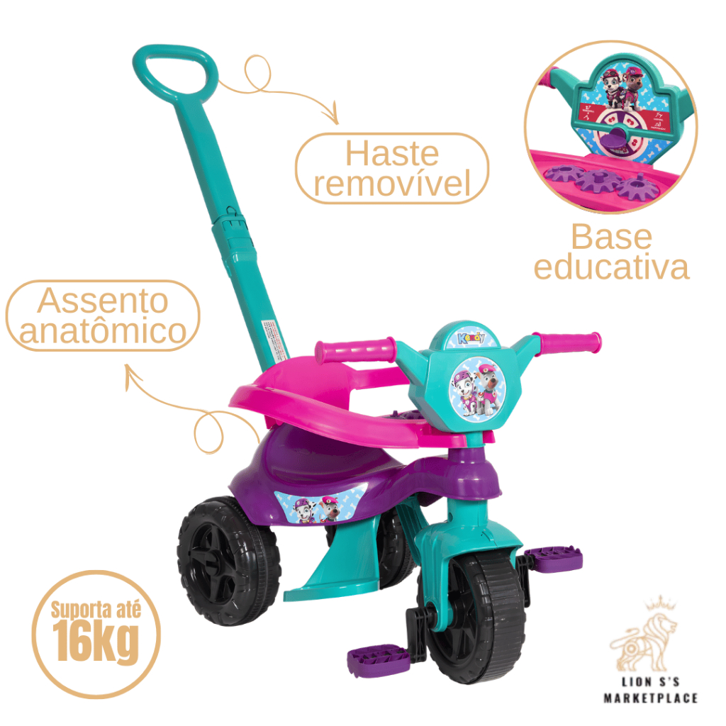 **ATENÇÃO** *Esse anúncio possui variação de cores e personagens* Motoca Triciclo Infantil Menino e Menina Haste Removível Pedais Embutidos O Triciclo Infantil com Haste é a escolha ideal para proporcionar diversão, segurança e desenvolvimento para os pequenos. Desenvolvido em polipropileno de alta qualidade e com eixo de metal reforçado, oferece resistência e estabilidade para acompanhar cada fase da criança. Perfeito para passeios ao ar livre, ele une conforto, praticidade e segurança em um único produto. ––––––––––––––––––––––––––––––––––––––––––––––––––––––––––––––––––––– BENEFÍCIOS • 2 em 1: passeio e pedal • Pode ser utilizado com haste para os pais conduzirem ou no modo pedal para a criança explorar com autonomia. • Suporta até 25 kg • Estrutura reforçada que garante segurança e durabilidade. • Haste removível: Permite maior controle durante o passeio e pode ser retirada quando a criança estiver pronta para pedalar sozinha. • Aro de proteção removível: Mais segurança para os menores e liberdade conforme o crescimento. • Assento anatômico • Conforto ideal para longos passeios sem desconforto. • Pedaleira removível • Facilita a adaptação conforme a idade e o desenvolvimento da crianças ––––––––––––––––––––––––––––––––––––––––––––––––––––––––––––––––––––– CARACTERÍSTICAS • Fabricado em polipropileno de alta qualidade • Haste longa para condução • Aro de proteção removível • Pedaleira removível • Assento anatômico • Cestinha frontal • Indicado para crianças a partir de 12 meses no modo passeio • Indicado para crianças a partir de 24 meses no modo pedal • Marca: Magic Toys ––––––––––––––––––––––––––––––––––––––––––––––––––––––––––––––––––––– DIMENSÕES Altura aproximada: 80 cm Comprimento aproximado: 97 cm Altura da haste: 41 cm ––––––––––––––––––––––––––––––––––––––––––––––––––––––––––––––––––––– Se você procura um triciclo seguro e resistente, este modelo foi desenvolvido com estrutura reforçada e eixo de metal para maior durabilidade. O aro de proteção oferece mais segurança para crianças menores, enquanto a haste garante total controle aos pais durante o passeio. Conforme a criança cresce, os acessórios podem ser removidos, acompanhando cada fase do desenvolvimento.