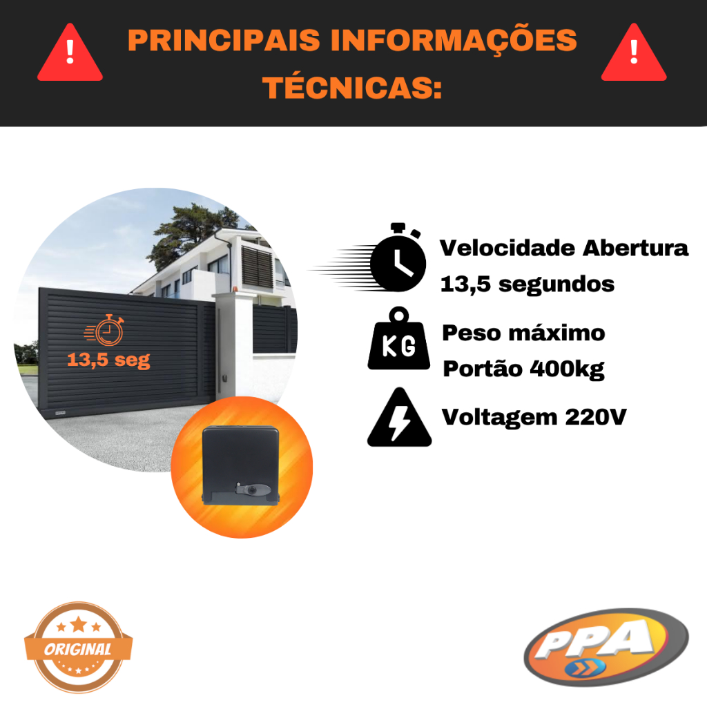Motor Portão Deslizante PPA DZ Stark Home 400 KL 220v sem Cremalheira ⚠ INFORMAÇÕES IMPORTANTES ❗❗: 📦 INCLUSO NO KIT : - 01 Motor 220V Marca PPA - Modelo DZ Stark Home 400 Mono - 01 Kit de instalação ( acessórios, parafusos, etc. ) - Manual de instalação. - Envio rápido em até 24hrs 📝 INFORMAÇÕES TÉCNICAS DO PRODUTO: -Voltagem: 220V -Peso máximo do portão: 400 kg -Velocidade de abertura: 13,5 segundos (em portão de 3 metros)* -Motor: Monofásico -Redução: 1:23 -Ciclos por hora: 15 -Frequência de saída: 60 Hz -Rotação do motor: 1740 RPM -Fim de curso: Analógico ou Digital -Engrenagem externa: Z14 -Coroa interna: Nylon com alma metálica -Marca: PPA / Linha: Stark Home ✅ BENEFÍCIOS: -Rápida instalação e alta compatibilidade com portões residenciais -Estrutura leve e resistente, com ótimo acabamento -Motor potente e silencioso -Excelente desempenho em portões de até 400 kg -Produto original com garantia e suporte técnico Automatizador de Portão DZ Stark Home 400 Mono – Rápido, Seguro e Durável Garanta mais comodidade e segurança no acesso à sua residência com o DZ Stark Home 400 Mono. Fabricado com polímero resistente e carcaça de alumínio, é compatível com todos os motores residenciais. Qualidade e confiabilidade PPA, referência em automação. 📝COMO CONFIGURAR? Vai com um manual de instalação, recomendamos que seja realizada por um profissional qualificado, pois não nos responsabilizamos pelo uso incorreto dos produtos. 🚚 ENVIOS E PRAZOS: - Enviamos em até 24hrs após a compra - Nota fiscal - Embalagem segura - Garantia do fabricante - Produto original ❓ FAQ - PERGUNTAS FREQUENTES❓ : 1- Esse automatizador é bivolt? Não. Ele está disponível na versão 220V ( temos outros anúncios de 127V ) 2- Funciona em portão de correr? Sim, o DZ Stark Home 400 Mono é ideal para portões deslizantes residenciais. 3- É compatível com controle remoto PPA? Sim, é 100% compatível com acessórios da linha PPA. 4- Posso instalar sozinho? A instalação deve ser feita por um técnico especializado, para garantir segurança e o funcionamento correto. 5- Tem garantia? Sim, todos os produtos PPA contam com garantia do fabricante. Consulte as condições. 6 – Vai com módulo wi-fi incluso? Não! Mas vendemos o módulo a parte. 🤝 Em caso de dúvidas, entre em contato com nossa equipe pelo campo de perguntas! Estamos a disposição para ajudar! 🤝