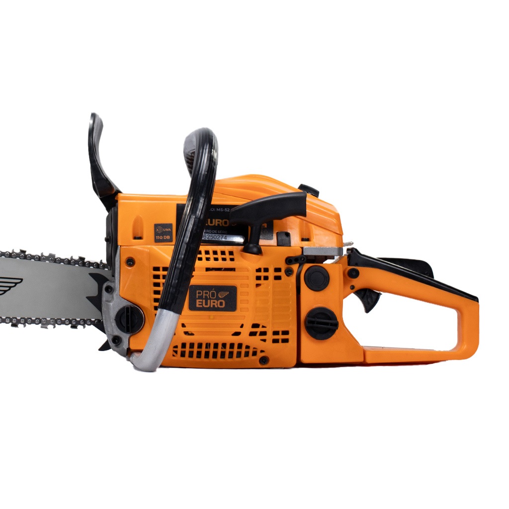 Motosserra A Gasolina Profissional Strong 3000 2.9hp 52cc Pró Euro Está motosserra da Pró Euro facilitará o seu trabalho! É adequada para corte profissional de todos os tipos de madeiras, para podar, cortar árvores e fazer inúmeros trabalhos de jardinagem. Agora você poderá cortar a vegetação com pouco esforço e em pouco tempo. :: Uso profissional e amador :: Modelo: Strong 3000 :: Material: Aço carbono, Alumínio, Plástico :: Refrigeração: Ar :: Cilindro: Monocilíndro (44mm) :: Tipos de combustível: Gasolina, Óleo :: Cilindrada: 52 cc :: Peso 5.6kg :: Potencia: 2.9 hp :: Comprimento das espadas compatíveis: 50cm :: Tipo de motorização:2 tempos :: Sistema de partida: Manual retrátil :: Sistema anti-vibração: Sim :: Carburador: Tipo diafragma :: Potência em KW: 2.2 :: Rotação máxima: 11.500 rpm :: Nível de ruído: 110 db :: Capacidade tanque de combustível: 0,550 Litros :: Mistura óleo/combustível: 25:1 :: Capacidade óleo lubrificante da corrente: 0,260 litros :: Freio de segurança: Sim :: Peso: 5,6 kg KIT ACOMPANHAMENTO: :: Dosador óleo :: Combustível :: Chave de vela combinada :: Chave allen 4 :: Chave allen 3 *Máquina possui número de série para licença de porte e uso de motosserra* Estamos a disposição. Equipe Pró Euro.