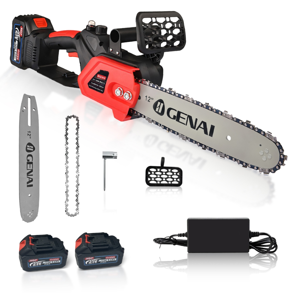 Equipada com sabre de 30 cm (a maior da categoria) e duas baterias de longa duração, a motosserra é indispensável para qualquer pessoa que possua jardim, árvores, pomares,etc. e profissionais da jardinagem. Ferramenta extremamente versátil, leve e fácil de operar, garante praticidade e eficiência em podas e corte de galhos em qualquer lugar, pois não depende de tomada de energia. Características: Ferramenta leve, silenciosa, rápida e com baixo consumo de energia; Punho emborrachado, garante a segurança e conforto durante o uso; Leve e compacta para se trabalhar com apenas uma mão; Corrente de aço temperado, extremamente afiada e resistente ao desgaste; Motor 100% cobre, proporciona alto torque e eficiência no corte; Bateria com carregamento rápido, com proteção de temperatura e sobrecorrente; Trabalho ininterrupto: O tempo de trabalho de uma bateria é o suficiente para carregar a outra; Fácil montagem e ajuste; Recomendada para uso doméstico ou profissional leve. Especificações Técnicas: Material: ABS e Metal Cor Principal: Vermelho/preto Potência: 1.200W Tamanho da corrente (linha de corte): 16 cm (6") Velocidade da corrente: 4200r/Min Baterias: Litio 21V, -> excelente durabilidade Peso da máquina com uma bateria: 2,4 Kg Itens Inclusos: 1x Motoserra elétrica de 1.200W 2x Baterias 21V 1x Corrente 12" 1x Caixa de papelão 1x Carregador Bivolt 1x Conjunto de ferramentas de montagem e ajuste 1x Proteção superior contra cavacos 1x Manual do usuário