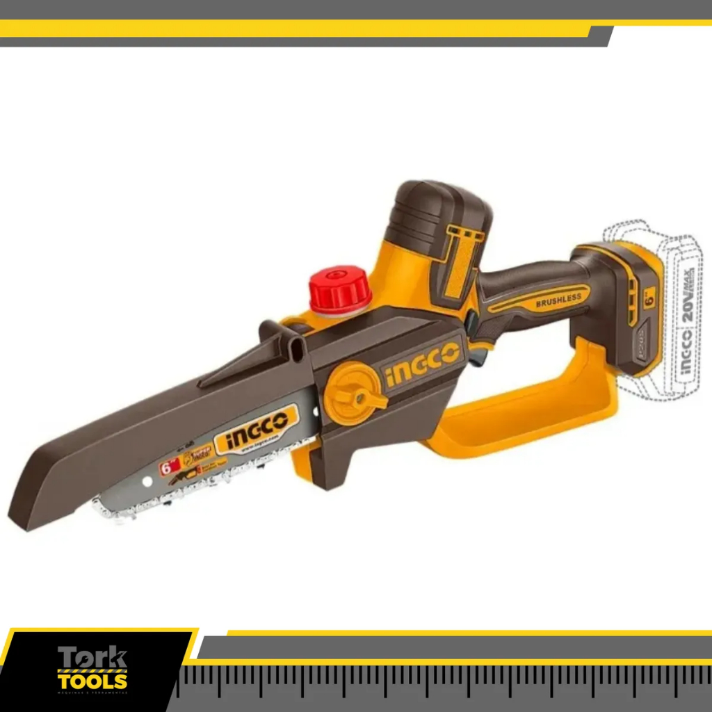 A mini motosserra a bateria 20V foi pensada para quem precisa fazer podas e cortes leves com mais agilidade e controle no dia a dia. Com barra de 6 pol (15 cm) e motor sem escovas (brushless), entrega um conjunto compacto para manutenção de jardins, quintais, sítios e serviços rápidos, reduzindo esforço e ganhando produtividade. Por ser a bateria, o manuseio fica mais prático e com menos dependência de tomadas, ajudando a trabalhar com mobilidade e organização. O kit acompanha 2 baterias de 2,0 Ah, carregador bivolt 2A e maleta plástica para transporte, além de lubrificação automática para manter a corrente trabalhando de forma mais constante durante o uso. Características - Kit com 2 baterias 20V 2,0 Ah - Carregador de bateria 20V bivolt 2A - Maleta plástica para transporte e armazenamento - Acompanha 1 corrente de serra 6 pol (15 cm) - Acompanha 1 barra de serra 6 pol (15 cm) - Acompanha 1 chave de aperto Informações Técnicas - Tensão: 20V - Motor sem escovas (BL - Brushless) - Comprimento da barra: 6 pol (15 cm) - Velocidade da corrente: 11 m/s - Lubrificação automática A escolha certa para quem busca cortes leves com praticidade, mobilidade e um kit completo para manter a rotina de manutenção sempre em dia. Marca: INGCO Modelo: Mini Motosserra BL 6 pol 20V
