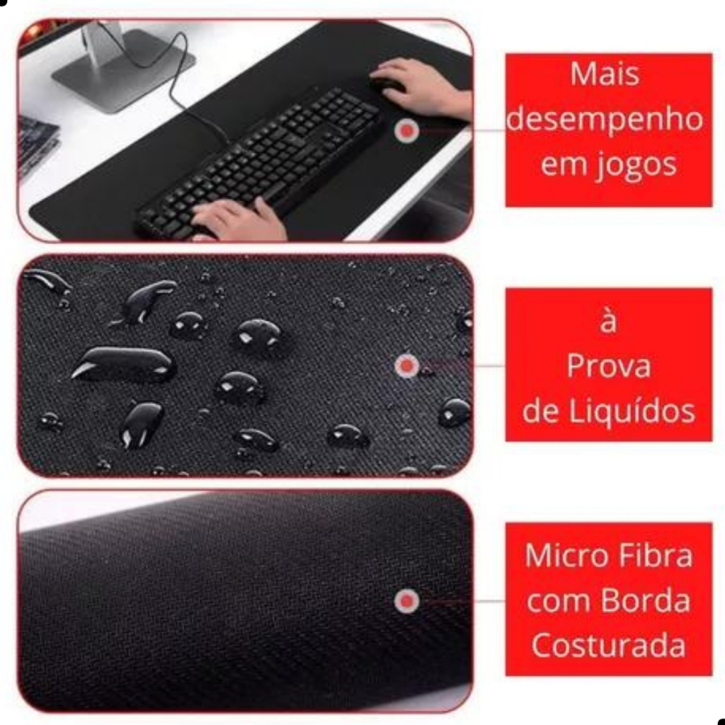 Mousepad Grande 90x40 Impermeável Speed Gamer Esse Deskpad Mouse Pad Extra Grande 90x40 Speed Gamer possui alta qualidade costurado com nylon lavável. O MELHOR MOUSEPAD EXTRA GRANDE 90x40 CM: Justifica o maior preço porque trabalhamos apenas com matéria-prima de primeira linha, ou seja, a QUALIDADE, ACABAMENTO e DURABILIDADE desse produto sem sombra de dúvidas INCOMPARÁVEIS com itens similares da concorrência que ficam DISPARADAMENTE para trás. Ideal para jogar ou no trabalho, o Mouse Pad Extra Grande Gamer 90x40 foi desenvolvido com modernas tecnologias que proporcionam alta sensibilidade no momento do jogo e isso vai te proporcionar um melhor desempenho na sua performance Comporta teclado e mouse juntos, superfície em tecido sintético com textura fina para velocidade máxima com menos esforço. Movimentação pixel-a-pixel e aperfeiçoado para mouses de qualquer sensibilidade e tipos de sensores. Informações Importantes sobre o produto: ESSE MOUSEPAD FICA LISO APÓS DESEMBALAR? NÃO TEM PERIGO DE FICAR DEFORMADO? Resposta: O produto vai embalado e enrolado da fábrica, Após algumas horas as "ondas" causadas pelo enrolamento, desaparecem. Recomendamos que após o produto chegar em seu domicilio, desenrole e o deixe descansar em superfície lisa por 48 horas. ESSE MOUSE PAD 90X40 É IMPERMEÁVEL? Resposta: Sim, ele é impermeável e à prova de líquidos. Você pode fazer limpeza com panos úmidos, e até deixar copos com água em cima do mousepad tranquilamente. Especificações do Produto: * Com superfície speed de tecido sintético, o mouse desliza com leveza e precisão em qualquer situação IN-GAME; * O uso de borracha texturizada cria aderência antiderrapante e sem cheiro, isso garante que ele não deslize e o teclado se mantenha fixo, mesmo em momentos de agitação nas partidas. * As bordas arredondadas e acabamento com costura de nylon garantem durabilidade. * O mousepad gamer é totalmente dobrável facilitando o transporte e sem ocupar o espaço. Ficha Técnica: Material: Tecido sintético, costura em nylon; Tamanho: 90cm (Largura), 40cm (Altura) e 3mm (espessura); Modelo "Speed"