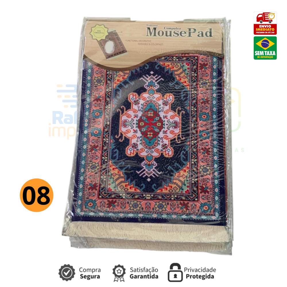 Lindo mouse pad retangular que imita um tapete persa. Com uma superfície que lembra veludo e faz com que o mouse deslize sem tirar a precisão, este lindo mouse pad possui uma base emborrachada, que evita que o produto fique se movendo pela mesa e conta ainda com franjas nas laterais, que dão aquele charme para a sua casa ou escritório. Material: Borracha e poliéster. Dimensões: - Largura: 26cm - Comprimento: 18cm OBS.: Não é um tapete grande, é um mouse pad.