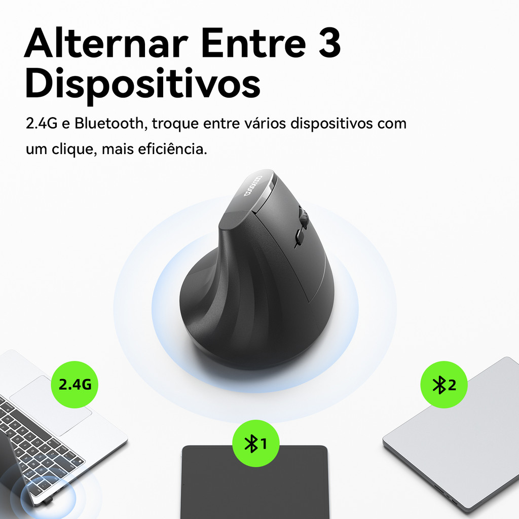2.4GHz + Bluetooth Modos duplos: Com tecnologia sem fio BT1 /BT2 e 2.4G, este mouse ergonômico sem fio permite alternar entre até 3 dispositivos simultaneamente, proporcionando desempenho sem costura para melhorar o trabalho mesmo em ambientes ocupados. Ao aplicar o modo de 2,4 GHz, basta conectar o receptor USB para conexão rápida sem a necessidade de instalação de software adicional. 57° Ângulo Vertical Ergonômico do nosso mouse vertical é projetado em um 57° Ângulo ergonômico da mão para manter a mão em uma posição mais natural, reduzindo a tensão muscular e a pressão do pulso. Desfrute de conforto durante todo o dia e melhora a produtividade, não há mais dor nas mãos ou fadiga. Desfrute de conforto durante todo o dia e melhora da produtividade, não há mais dor nas mãos ou fadiga. Níveis de DPI de 5 precisão: Este mouse vertical ergonômico apresenta uma faixa de DPI alta com cinco níveis ajustáveis (800 / 1200 / 1600 / 2400 / 3200). Com apenas um clique, você pode alternar facilmente entre as configurações de sensibilidade, desde o controle ultrapreciso para tarefas, como design gráfico para movimentos rápidos e responsivos para jogos. Aproveite o equilíbrio perfeito de precisão e velocidade para qualquer aplicação. Mouse Silencioso para Escritório: O mouse vertical ergonômico oferece operação silenciosa com cliques quase silenciosos à esquerda e à direita, tornando-o ideal para ambientes silenciosos como bibliotecas ou trabalho noturno. Ajude seu trabalho ou estudo a se concentrar, evitando perturbações aos outros. Não precisa carregar: Alimentado por duas pilhas AAA (incluídas), este mouse oferece até cerca de 3 meses de uso diário. O trabalho sem costura e o reduzido do incômodo com desempenho confiável e duradouro. "Sistemas Compatíveis: Compatível com Win XP / Vista / Win 7 / Win 8 / Win 10 / Win 11 ou acima, e Mac OS.