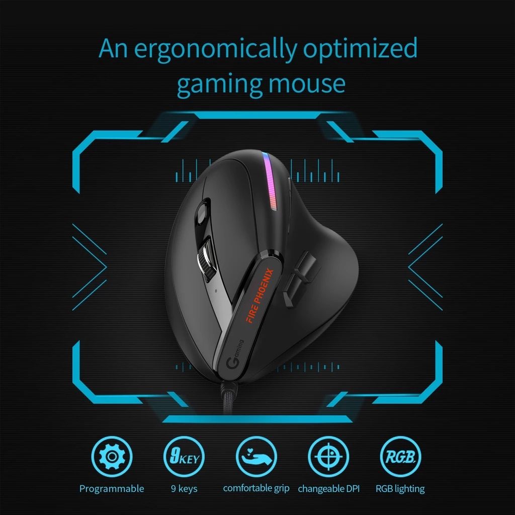 Mouse vertical com fio, 6 botões, com luz RGB, ajustável entre 3200-4800-12800 DPI, para computadores e laptops.