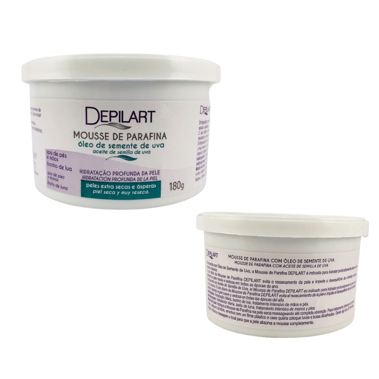 Mousse de Parafina Semente de Uva 180g – Depilart Cuide da sua pele com um toque de nutrição e proteção! A Mousse de Parafina Depilart com Semente de Uva foi especialmente desenvolvida para hidratar profundamente, proteger e restaurar a pele, sendo ideal para tratamentos de hidratação corporal intensiva, inclusive durante e após procedimentos de depilação ou exposição ao sol. Textura Leve com Ação Profunda Diferente das parafinas tradicionais, sua textura em mousse cremosa e suave promove rápida absorção, sem deixar a pele oleosa. Enriquecida com óleo de semente de uva, rica fonte de vitamina E e antioxidantes, a fórmula atua na renovação celular e prevenção do ressecamento, deixando a pele macia, nutrida e com um aspecto saudável. Ideal para Uso Diário ou Profissional A Mousse de Parafina Depilart é indicada tanto para uso doméstico quanto para tratamentos estéticos profissionais, como hidratação intensiva com o uso de luvas e botas térmicas, massagens ou como finalização de processos depilatórios. Principais Benefícios: Hidratação profunda e duradoura Rica em óleo de semente de uva – antioxidante e regenerador Previne ressecamento e descamação da pele Textura mousse leve e fácil de espalhar Ideal para mãos, pés, pernas e braços Pele mais macia, luminosa e protegida Modo de Uso: Aplique uma quantidade suficiente da mousse sobre a pele limpa e seca, espalhando com movimentos circulares até completa absorção. Para hidratação intensiva, utilize luvas ou botas térmicas. Especificações: Marca: Depilart Tipo: Mousse de Parafina Hidratante Ativo principal: Óleo de Semente de Uva Peso: 180g Indicação: Corporal Uso: Pessoal ou profissional