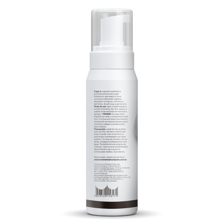 Mousse Curly Care Espuma Modeladora Profissional 280ml - Espuma modeladora profissional e com alto poder hidratante, que realça e fixa a curvatura natural dos cabelos, deixando-os macios, soltinhos e definidos, do jeito que a gente ama. - Na Curly Care, a gente deu um jeitinho de buscar inspiração nessas características e preparar uma receita de Mousse especial, mas essa é para o seu cabelo! As escolhas dos ingredientes para essa receita foram as seguintes: EXTRATO: Para trazer hidratação e formação de filme naturais escolhemos o extrato de aloe vera. ÓLEO: Um óleo leve e ideal para fórmulas de finalização – o óleo de semente de uva. PROTEÍNA: Aqui, inserimos a proteína de arroz, que deixa os fios mais macios, resistentes, brilhantes e pode melhorar o volume. TECNOLOGIA VIC-FIX: Proporciona proteção térmica e definição com fixação duradoura. Alinha as cutículas da fibra capilar, prevenindo a perda natural de água dos fios. - Produtos Veganos - Ingredientes Naturais - Liberado para No Poo - Não testado em animais - Livre de Sulfatos, Parabenos, Silicone e Petroderivados Como usar o Mousse em diferentes curvaturas Sugestão de uso na finalização!!! Ondulado: - Para uma finalização que estimule as ondas, inicie aplicando um de nossos leave-ins, seja o Be Free ou o Be Strong, mecha a mecha e formando fitas. Após concluída a aplicação em todo o cabelo, aplique o Mousse do comprimento às pontas com movimentos de amassar de baixo pra cima. Esse movimento irá estimular a definição da sua curvatura. Cacheado: - Para uma finalização poderosa, inicie aplicando um de nossos leave-ins, seja o Be Free ou o Be Strong, mecha a mecha e formando fitas. Após concluída a aplicação em todo o cabelo, aplique o Mousse do comprimento às pontas com movimentos de amassar de baixo pra cima. O Mousse hidrata o cabelo e tem a capacidade de definir os fios com aparência soltinha e natural. Crespo: - Para uma finalização nos cabelos crespos, separe-os em mechas pequenas, aplique primeiro o leave-in Be Free ou o Be Strong, e na sequência já aplique o Mousse. Conclua a aplicação em todo o cabelo, mecha por mecha. Pode deixar secar ao natural ou usar o difusor com o secador quentinho, porque o Mousse Modelador Profissional da Curly Care tem proteção térmica. COMO USAR - Após a higienização e condicionamento dos fios, separe o cabelo ainda molhado em mechas e aplique o MOUSSE em suas mãos. Espalhe por todo o comprimento dos- fios. Conclua com leves movimentos amassando as mechas de baixo paracima para realçar a curvatura dos seus cabelos.