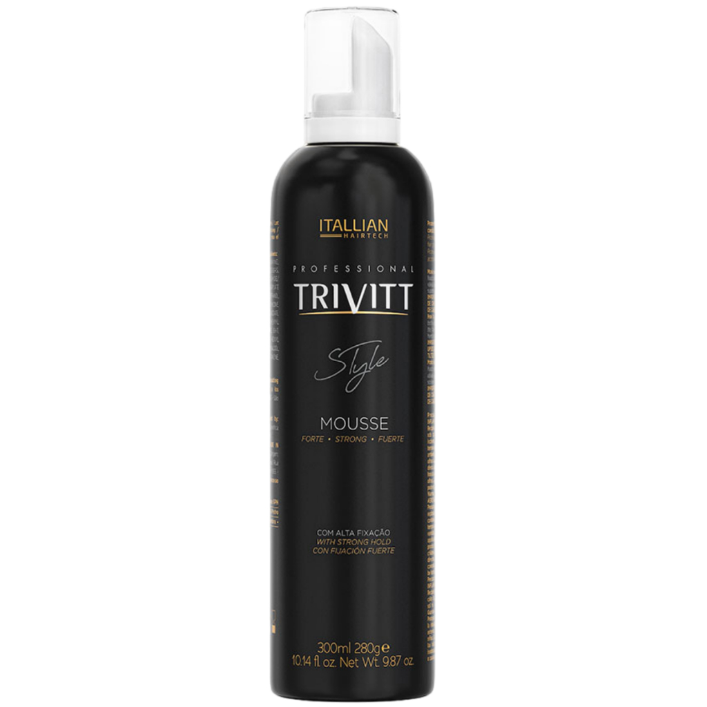 Itallian Trivitt Style Mousse facilita a criação de penteados com fixação forte, brilho e condicionamento, protege o cabelo da umidade e dos raios ultravioletas com proteção solar UV, além de deixar os fios maleáveis e sem resíduos. Ativos: Agente para Fixação e Estilização: Polímero com ótima adesão à fibra capilar, muito utilizado em sistema aerossol. Promove fixação forte mesmo em ambientes com alta umidade Não forma “flakes” (falsa caspa) Os polímeros podem ser facilmente removidos ao pentear os fios ou na próxima lavagem, com a aplicação de um shampoo Filtro Solar: absorve de forma eficiente a radiação UV-B. Protege os fios contra os danos provocados pela radiação UV-B É resistente à água Modo de Uso: Agite bem antes de usar. Coloque o frasco de cabeça para baixo e pressione a válvula até obter o volume necessário de espuma para a aplicação. A espuma poderá ser aplicada apenas na raiz para suporte ao penteado ou em todos os fios. IMPORTANTE: UTILIZE O FRASCO SEMPRE DE CABEÇA PARA BAIXO (NUNCA USE-O DE CABEÇA PARA CIMA OU INCLINADO).