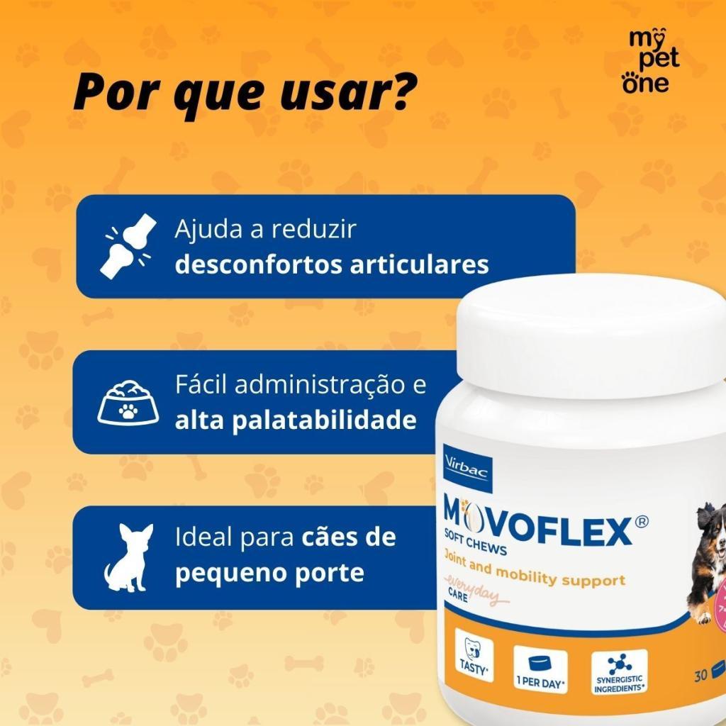 Movoflex Virbac – 6g O Movoflex Virbac é um suplemento condroprotetor de alta tecnologia indicado para cães, auxiliando na saúde das articulações e na melhora da mobilidade. Sua fórmula inovadora contribui para o conforto articular, flexibilidade e qualidade de vida, sendo ideal para pets que sofrem com desgaste das articulações, idade avançada ou que precisam de suporte locomotor. Possui apresentação mastigável de fácil aceitação, facilitando a administração diária. Benefícios: Auxilia na saúde das articulações Contribui para maior mobilidade e flexibilidade Ajuda a reduzir desconfortos articulares Fácil administração com alta palatabilidade Ideal para cães de pequeno porte ou uso sob orientação veterinária Especificações: Produto: Suplemento Articular Para Cães Apresentação: Tablete Mastigável 6g Indicação: Suporte À Saúde Das Articulações Espécies Indicadas: Cães Modo De Uso: Administrar Conforme Orientação Do Médico Veterinário